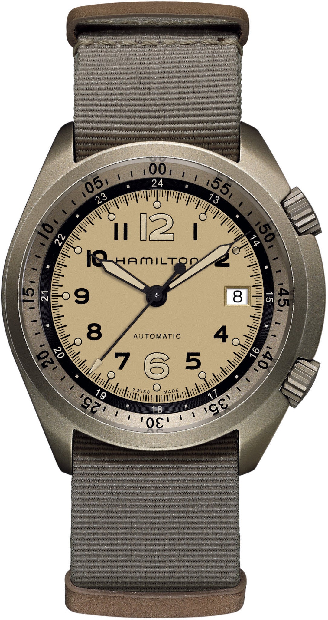 Hamilton Watch Khaki Aviation Pilot Pioneer Aluminum. Wearers of the Khaki Pilot Pioneer Aluminum will certainly travel light. Hamilton has drawn on its flying heritage to inspire the first of its timepieces ever to integrate aluminum, the material that propelled the aerospace sector to new heights with its use in planes, space shuttles and even rocket fuel. This versatile metal facilitates design that brings the magic of flight to the wearer's imagination and unrivalled comfort to their wrist. The range comprises four shades associated with outdoor action in the field, from a sultry sand color through to khaki green, and from bold black to the navy of pristine pilot uniforms.