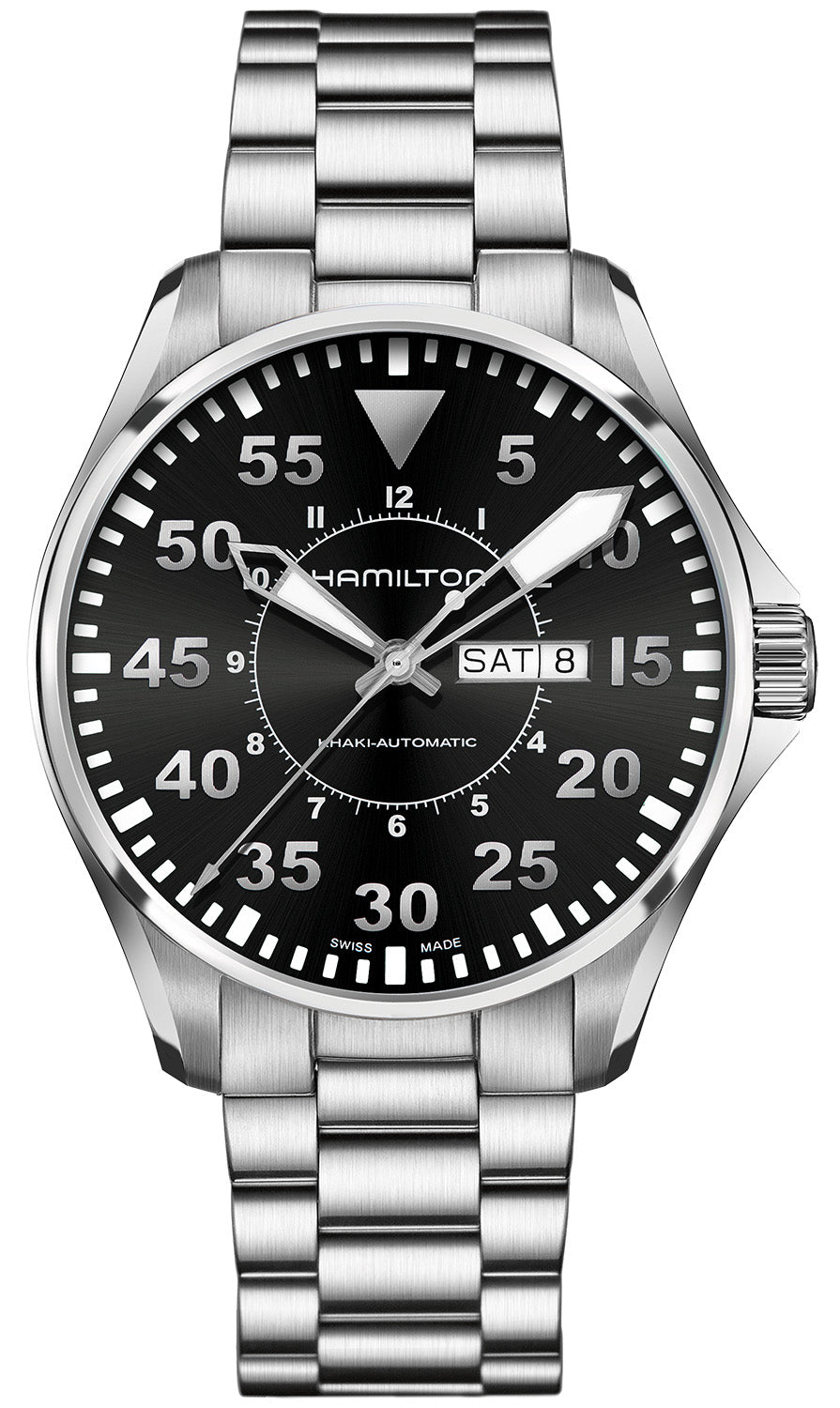 Hamilton Watch Khaki Aviation Pilot 46mm Auto H64715135. The Khaki Pilot gives the wearer the feel of an early American pilot with its classic aviator design. It features a large, easy to read dial, day and date function, and superluminova hands. The Khaki Pilot is an essential piece of form and function for any pilot. The model exists in 46 and 38mm to fit all the wrists.