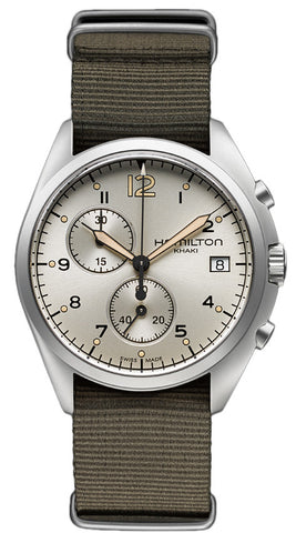 Hamilton Watch Khaki Aviation Pilot Pioneer Chrono. The Khaki Pilot Pioneer Chrono Quartz is inspired by the traditional military aviation watches from the 70s, specifically the model that Hamilton designed for the Royal Air Force. The Superluminova hands make the dial on the Pilot Pioneer perfectly readable and both the Nato and leather strap are reminiscent of the military roots of the Pilot PioneerÕs ancestor. The two asymmetric counters and case propel the watch in the modern time.