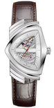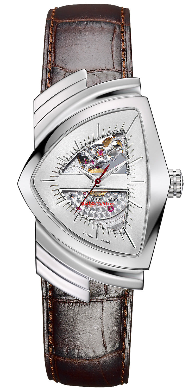 Hamilton Watch American Classic Ventura Automatic H24515551. A shield shaped timepiece, the Ventura is a faithful tribute to the original 1957 model, which made watch-making history as the worlds first electrical, battery powered watch. Design detail of the case of the new model mirrors that of its 1950s ancestors. This automatic version has openings to reveal the movement at work and a special design of the crown to ensure that it always stays in position.