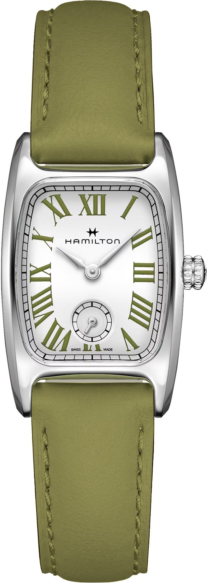 Hamilton Watch American Classic Boulton Small Second H13321813. Featuring an artfully curved case shape and distinctive Art Deco design, the Hamilton Boulton M is reimagined in bold colors inspired by classic macaron flavors. The timepiece's beautiful pearl white dial is enhanced with Roman numerals in pistachio green and complemented by a matching leather strap to complete the look. Exploring a palette of delicious color combinations, the Hamilton Boulton is an enticing sweet treat for the wrist. Seamlessly marrying the old and the new, this timepiece exudes feminine flair that is both fresh and timeless.
