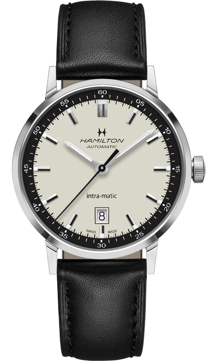 Hamilton Watch American Classic Intra Matic Auto H38425720. With a striking two-tone dial, the Intra-Matic Automatic has a vintage infused style that will transition from the office to a weekend getaway without missing a beat. Powered by our exclusive H-10 movement featuring the anti magnetic alloy Nivachron, this standout 40mm timepiece is precise, reliable and full of character.