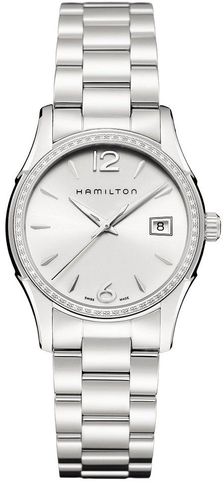 Hamilton Watch American Classic Jazzmaster Lady Quartz H32381115. The simple, unassuming style of the Jazzmaster Lady creates an image of grace, poise and class. Available in 27mm, 30mm and 34 mm case size, these Quartz timepieces are offered in varying bracelet and strap colors and styles. Dials are available in black, white and mother of pearl with several models offering the option of diamond accents.
