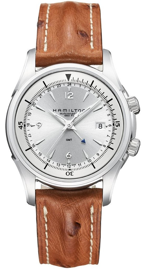 Hamilton Watch American Classic Jazzmaster GMT Traveler H32625555. The JAZZMASTER GMT with its second time zone brings the Jazzmaster line to new destinations. Its red or blue hand indicating the second time zone and 24 hours dial make a bold statement in the Jazzmaster collection showing that classic watches travel the world.