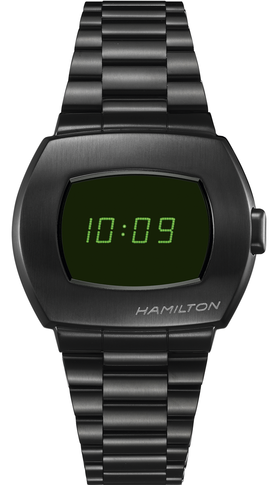 Hamilton Watch American Classic PSR MTX Digital Quartz Limited Edition H52434130. Join the ranks of Neo, Trinity, Morpheus and more with a style that stands out in any reality with the Hamilton PSR MTX. Limited to 1999 pieces in honor of the original films premiere, the sleek, all black timepiece celebrates the return to the Matrix with green LCD numerals and the movies immediately recognizable digital rain pattern inscribed on the case back and on the watches special packaging.