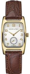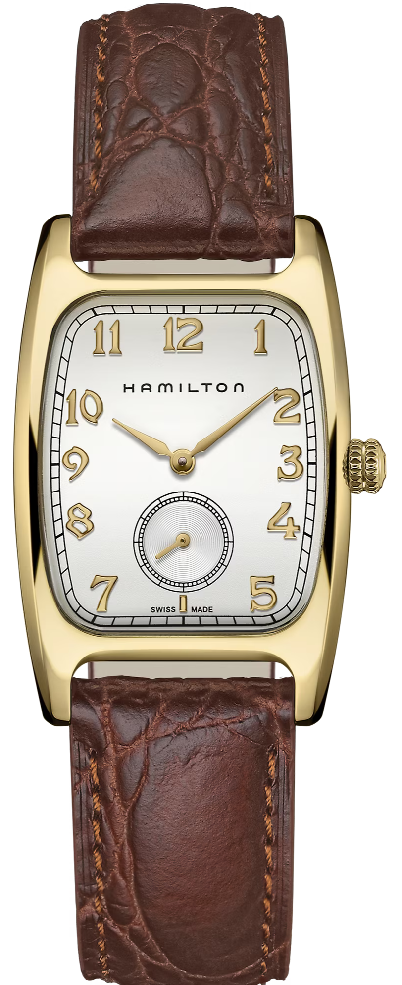 Hamilton Watch American Classic Boulton H13431553. Boulton is possibly one of the most popular Hamilton watches ever originally produced in the 1940s. Todays Boulton has a reshaped strap that follows the line of the case. The silver dial bears gold colored numbers and hands plus a round second counter. This classic has one foot firmly planted in the rich Hamilton heritage and the other in cutting edge Swiss watch making technology. Boulton is powered by an ETA 980.163 movement.