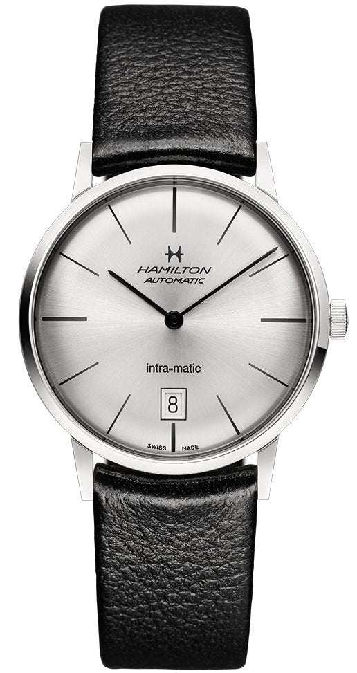 Hamilton Watch American Classic Intra-Matic . Paying a proud tribute to a Hamilton best seller from days gone by, the new timepiece makes an elegant statement through the purity of its design. The black or silver-colored dial is domed and plays host to two lightly curved hands, an expression of the quintessential character of Hamilton watchmaking.