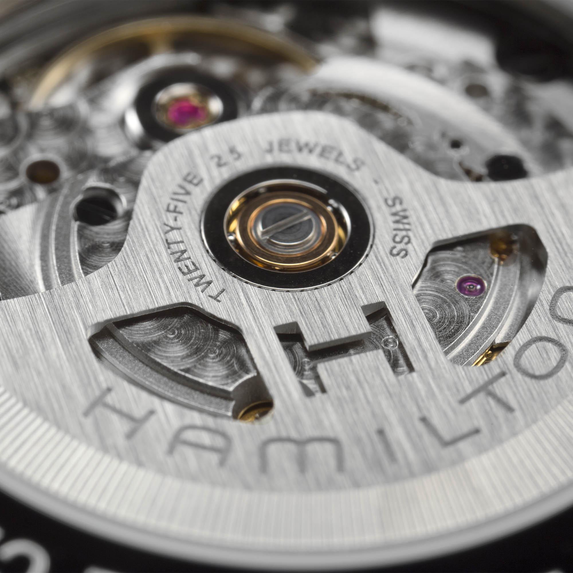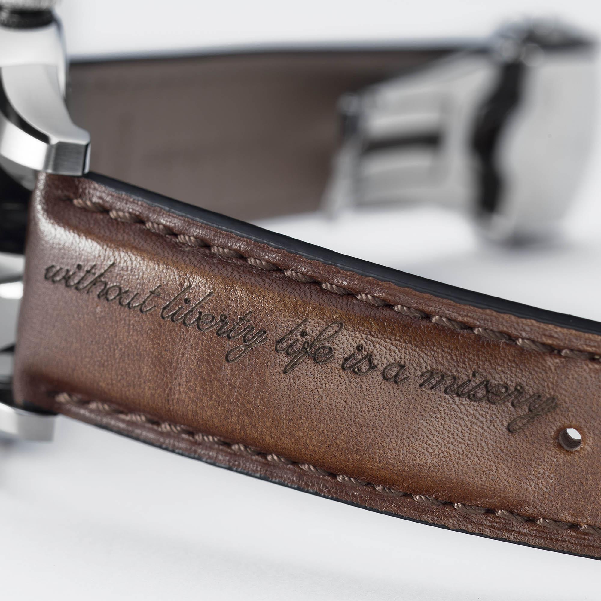 Hamilton Watch American Classic Timeless Classic Spirit of Liberty H42415591. Elegantly laser engraved across the luxury patina strap of the Hamilton Spirit of Liberty are the profound words, Without liberty, life is a misery. The new Hamilton movement H-10 with a typical 80 hours power reserve and its exclusive decoration and skeletonized rotor, add a contemporary sense to the traditional precision of timekeeping.