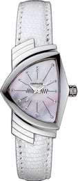 Hamilton Watch American Classic Ventura. The Ventura is a faithful tribute to the original 1957 model, which made watch-making history as the worlds first electrical, battery powered watch. Design detail of the case of the new model mirrors that of its ancestors. The dial is reminiscent of the 1950s Ventura timepieces, complete with digit markings all culminating in an embossed rounded point looking like atoms.