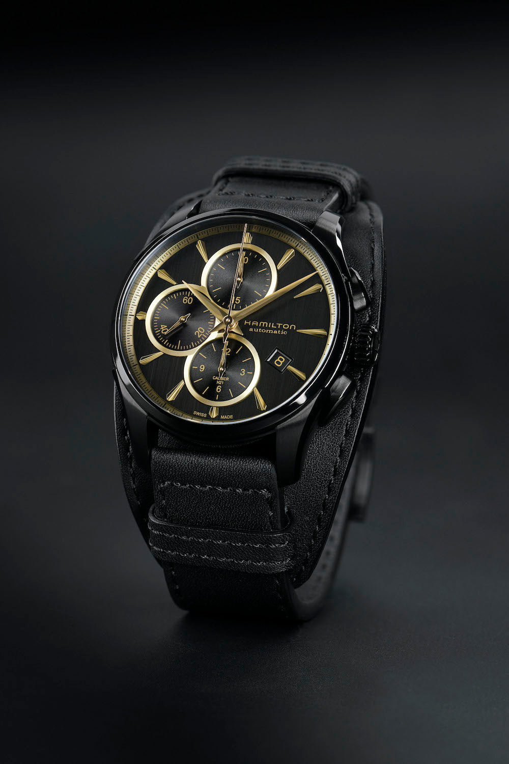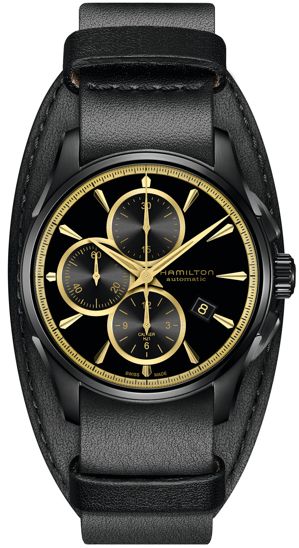 Hamilton Watch Jazzmaster Auto Chrono Black & Gold H32506730. Shine bright with the two-tone design. Embodying the mystery and glamour of Hollywood, our black and gold capsule is comprised of five celebrated timepieces: 36mm Jazzmaster Auto, 42mm Jazzmaster Auto Chrono, Pan Europ, Ventura Chrono Quartz and Ventura S. Playing on the contrasts of the glitz and grit, the capsule is a perfect definition of the big screen.