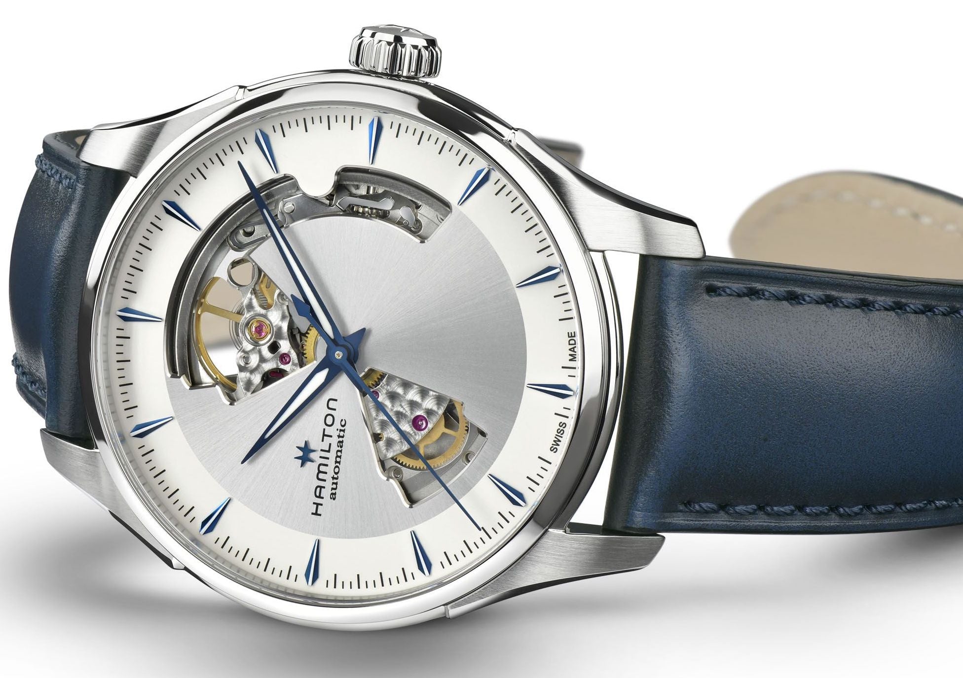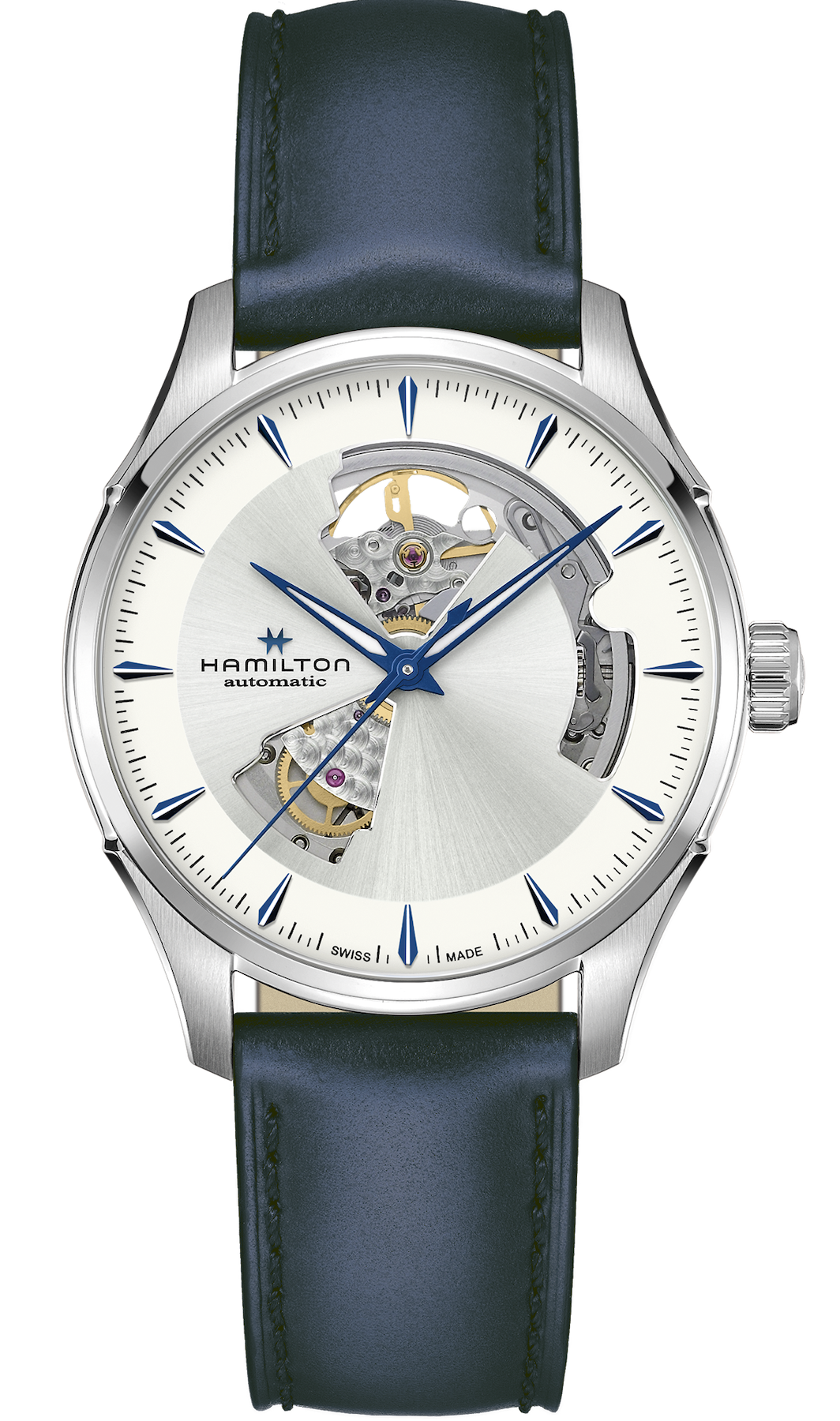 Hamilton Watch Jazzmaster Open Heart Auto H32675650. Classic watchmaking meets contemporary design in this blue and silver Jazzmaster Open Heart Automatic. Precision cutouts in its 40mm dial offer a glimpse at the Swiss-made movement inside and give this sophisticated timepiece a powerful personality all its own.