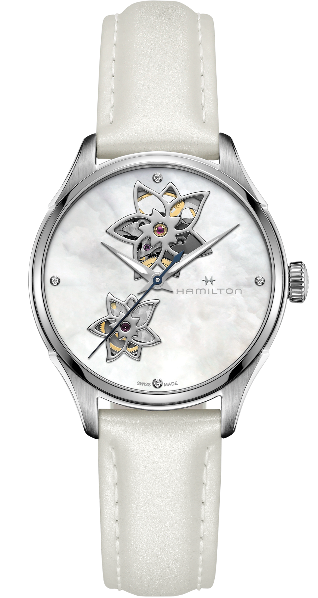 Hamilton Watch Jazzmaster Open Heart Lady H32115892. For those who enjoy the finer things in life, the Jazzmaster Open Heart is fascinating whichever way you look at it. Powered by the H-10 movement and featuring 80 hours of power reserve, it delivers beauty through strength and is enhanced with a mother-of-pearl dial and four applied diamond indexes.
