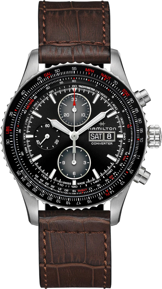 Hamilton Watch Khaki Aviation Converter Auto Chrono H76726530. Advanced technology for the sophisticated aviator. Calculate critical conversions and metrics at a glance with the Khaki Pilot Converter Auto Chronos bidirectional, rotating slide rule bezel. This high performance tool converts units, such as feet to meters or miles to kilometers, and currency. Add in the H-21-Si automatic chronograph movement with its superior anti-magnetic silicon hairspring and this stylish 44mm pilots watch has everything you need for your next adventure in the sky.