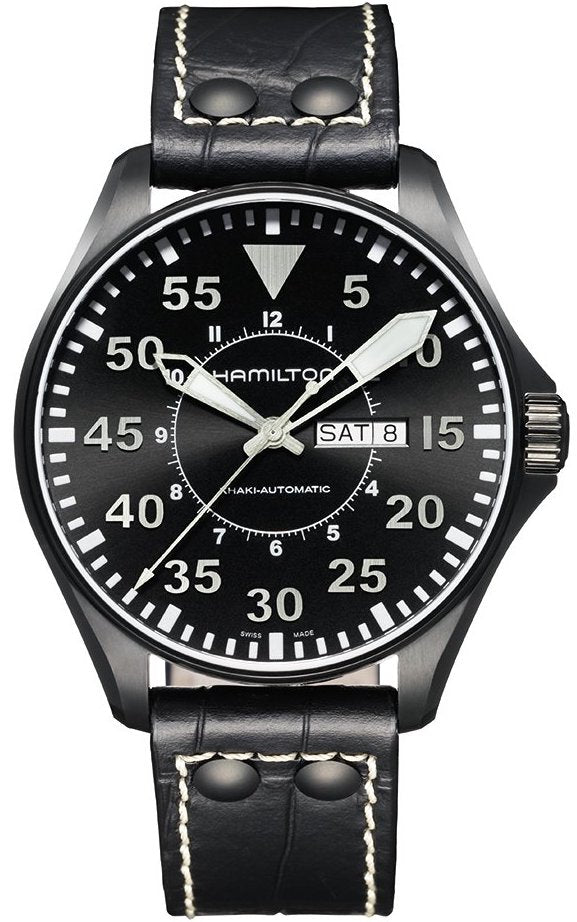 Hamilton Watch Khaki Aviation Pilot Auto H64785835. The Khaki Pilot gives the wearer the feel of an early American pilot with its classic aviator design. It features a large, easy to read black dial, day and date function, black leather strap, and superluminova hands. The Khaki Pilot is an essential piece of form and function for any pilot.