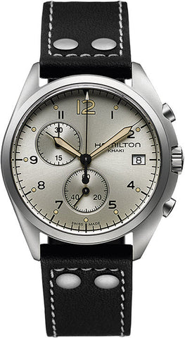 Hamilton Watch Khaki Aviation Pilot Pioneer Chrono Quartz. The Khaki Pilot Pioneer Chrono Quartz in a black leather strap is inspired by the traditional military aviation watches from the 70s, specifically the model that Hamilton designed for the Royal Air Force. The Superluminova hands make the silver dial on the Pilot Pioneer perfectly readable and the strap is reminiscent of the military roots of the Pilot Pioneer's ancestor. The two asymmetric counters and case propel the watch in the modern time.