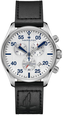Hamilton Watch Khaki Aviation Pilot Chrono Red Bull Air Race H76712751. Accompanying our trailblazing quartet on the 2018 circuit will be the new Khaki Pilot Air Race Chrono Quartz. The sporty quartz chronograph comes with a choice of stylish leather strap or metal bracelet, a 44mm stainless steel case and a gray and blue dial with 60 second, 30 minute and 12 hour counters. There is also a special case back engraving with the official Red Bull Air Race logo. With subtle red and blue details and a checkered flag at 12 o clock, its a perfect mix of aviation style and Swiss made precision.