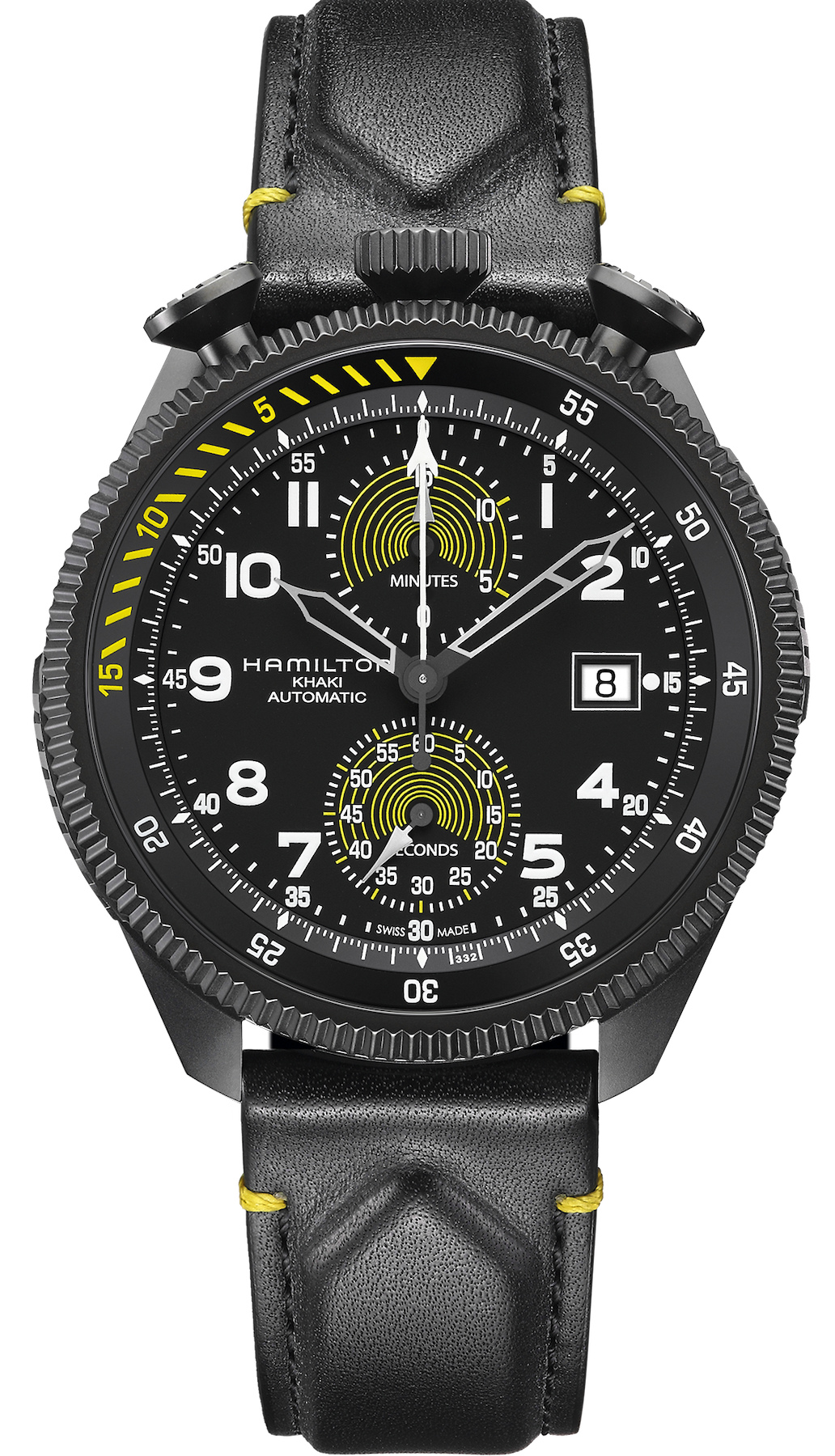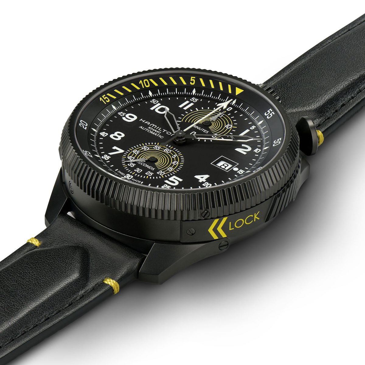 Hamilton Watch Khaki Aviation Takeoff Auto Chrono Limited Edition H76776733. A special edition to celebrate the world record tunnel flight by Italian pilot Dario Costa. Powered by our H-31 automatic chronograph movement, the 46mm timepiece features a unique function designed to meet the needs of pilots: a removable case you can attach to a fixed dash mount. As a nod to the two tunnels Dario flew through at record speed, both sub dials feature yellow rings, and the 12 o clock counter is adapted to a 15-minute countdown. Super LumiNova is only applied to the seconds hand and indicators through 43, commemorating Dario’s 43-second flight. Limited to 100 pieces, a reference to the maximum possible flying height (100cm) in both tunnels, each Takeoff comes with special packaging and a dash mount.
