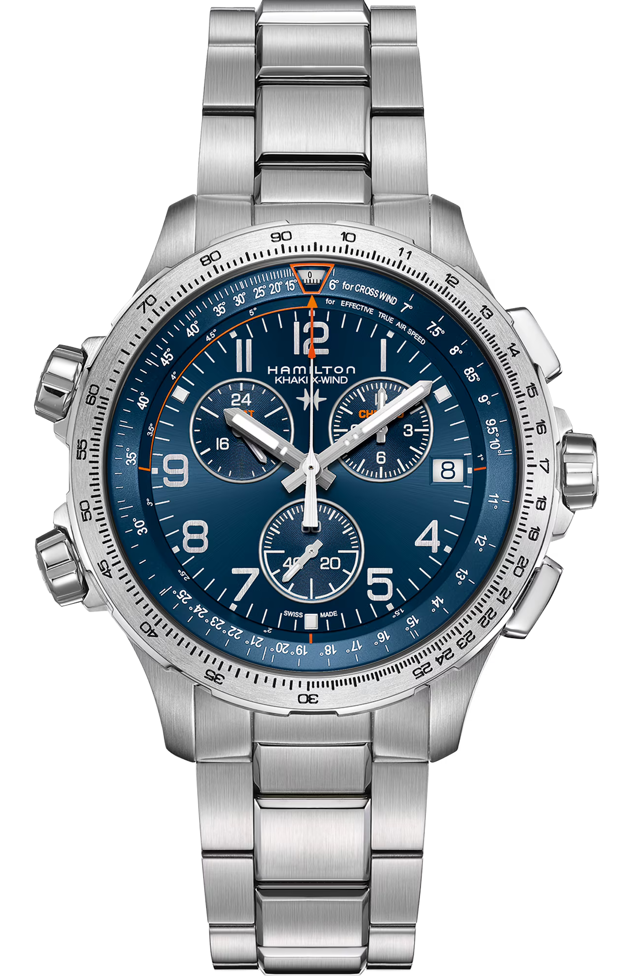 Hamilton Watch Khaki Aviation X-Wind GMT Chrono Quartz H77922141. Crosswind calculator, chronograph and now a second time zone: It takes a super sized 46mm stainless steel case to contain all the aviation features the Hamilton designers have packed into this latest addition to the Khaki X-Wind collection. Adventure meets accuracy and makes a lasting impression, whether you're the captain of the craft or on board as a passenger.