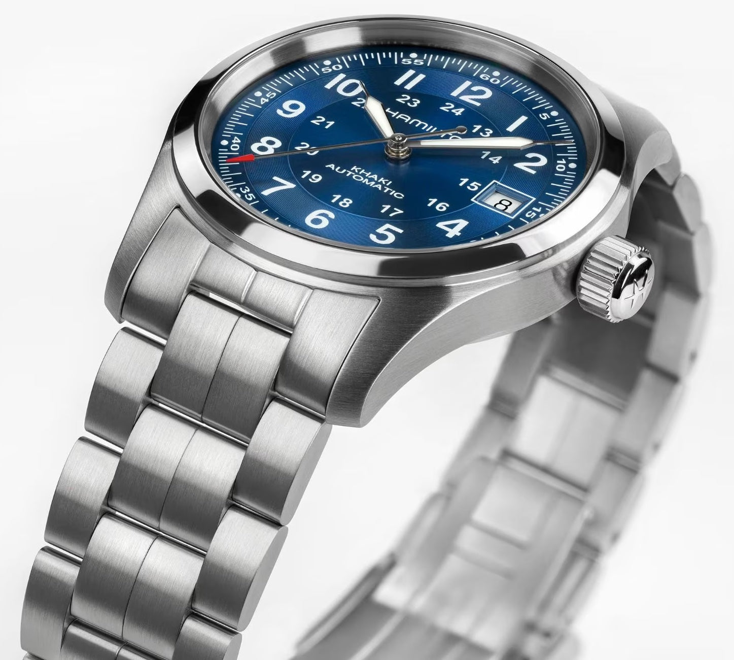 Hamilton Watch Khaki Field Automatic H70455140. Inspired by the original soldiers' watch, the Khaki Field Automatic blends military heritage with contemporary design and offers versatility for modern pioneers. Pairing a navy sunray dial with a snailing effect on the hour ring, the dial reflects light whilst boasting texture and depth. Designed for action and built for adventure, the exclusive H-10 automatic caliber offers up to 80 hours of power reserve, ensuring it won't let you down.