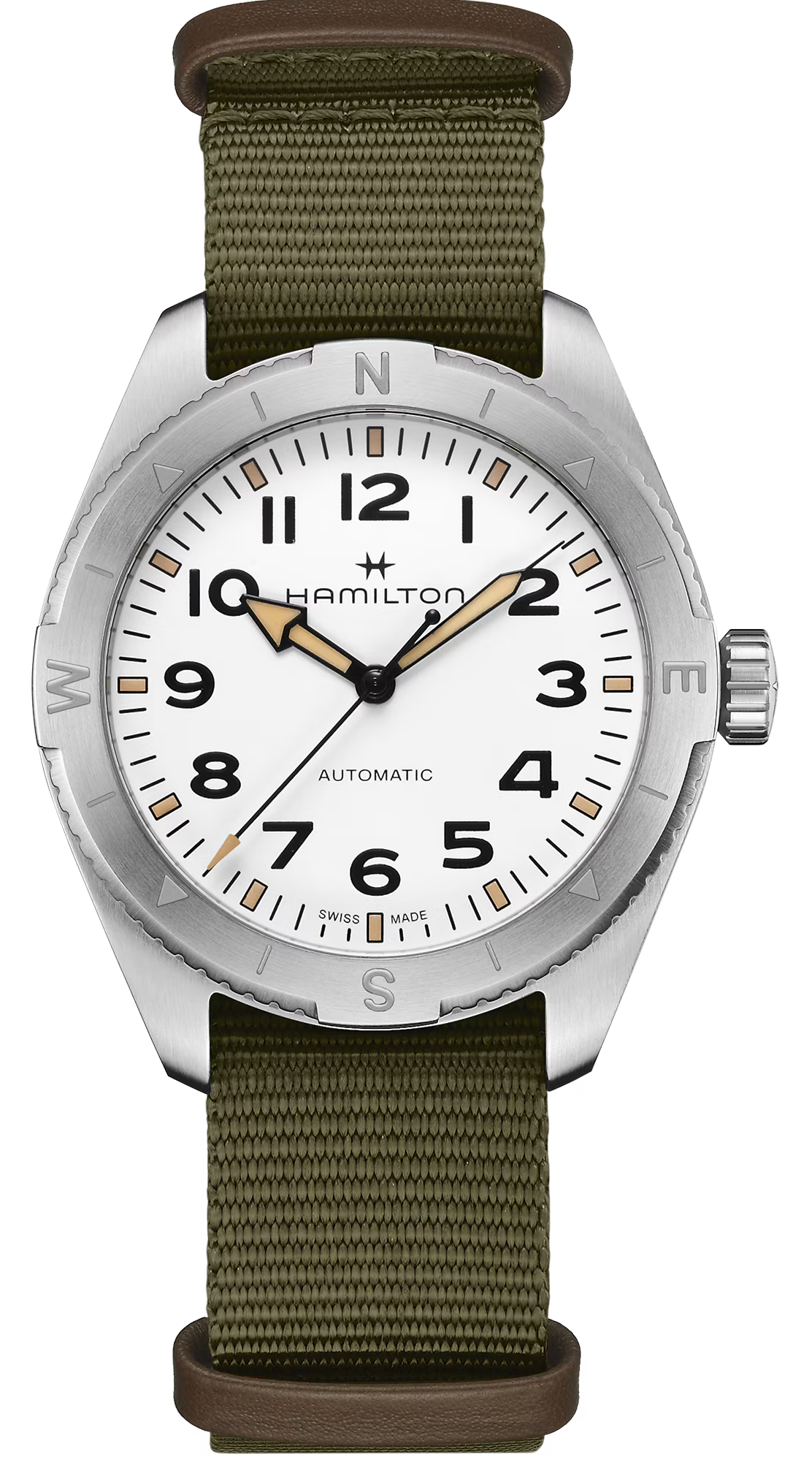 Hamilton Watch Khaki Field Expedition Auto H70315910. Gearing up for the great outdoors just got easier, thanks to the Khaki Field Expedition and its new NATO Strap. An all-terrain adventure watch with a compass design, enabling you to navigate your next excursion with the help of the sun. Housed in a 41mm stainless steel case and paired with a green NATO textile strap, it is equipped with a screw-down crown and a white sandblasted dial, making it your toughest timepiece yet.
