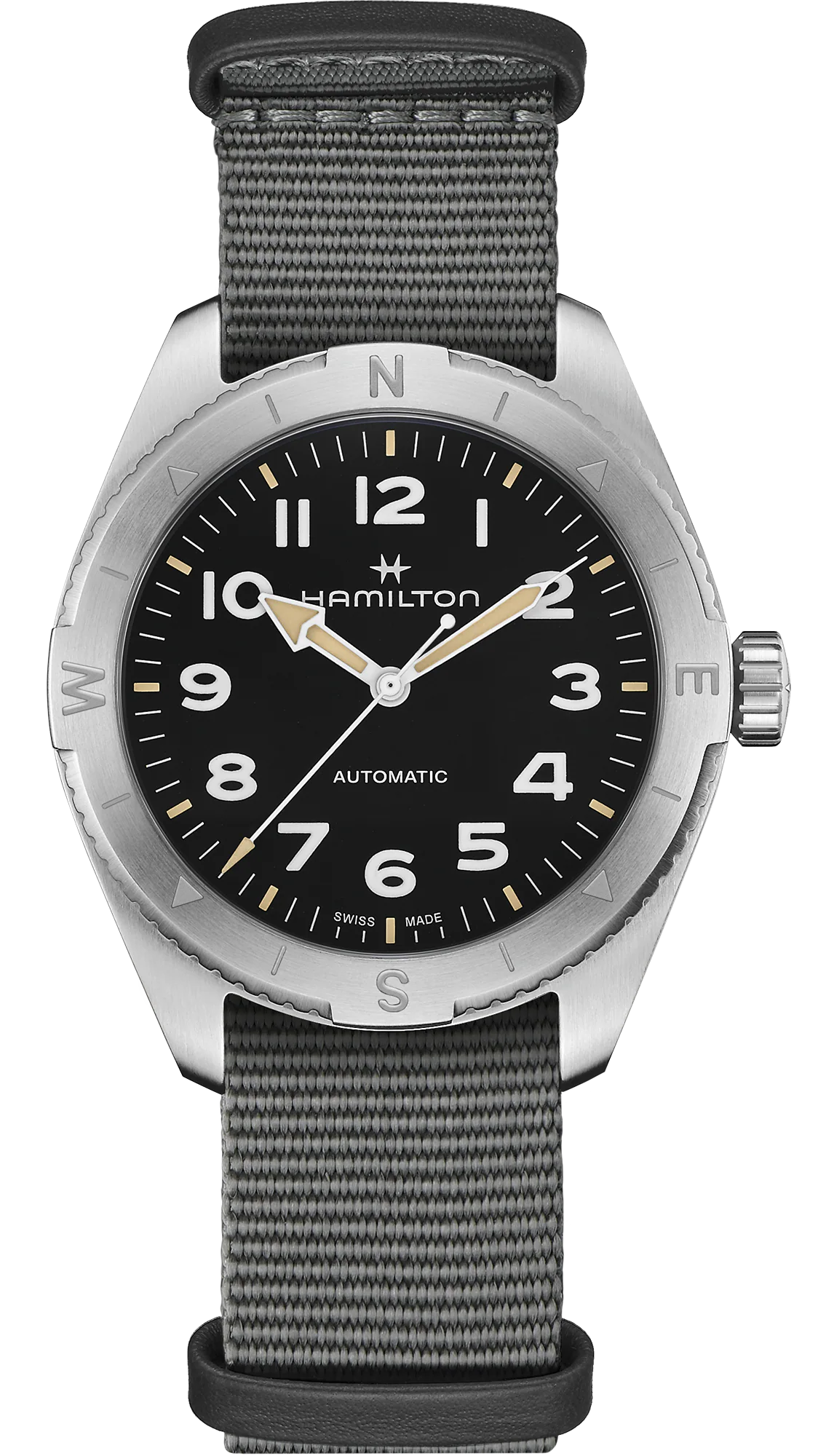 Hamilton Watch Khaki Field Expedition Auto H70315930. Gearing up for the great outdoors just got easier, thanks to the Khaki Field Expedition and its new NATO Strap. An all-terrain adventure watch with a compass design, enabling you to navigate your next excursion with the help of the sun. Housed in a 41mm stainless steel case and paired with a grey NATO textile strap, it is equipped with a screw-down crown and a black sandblasted dial, making it your toughest timepiece yet.