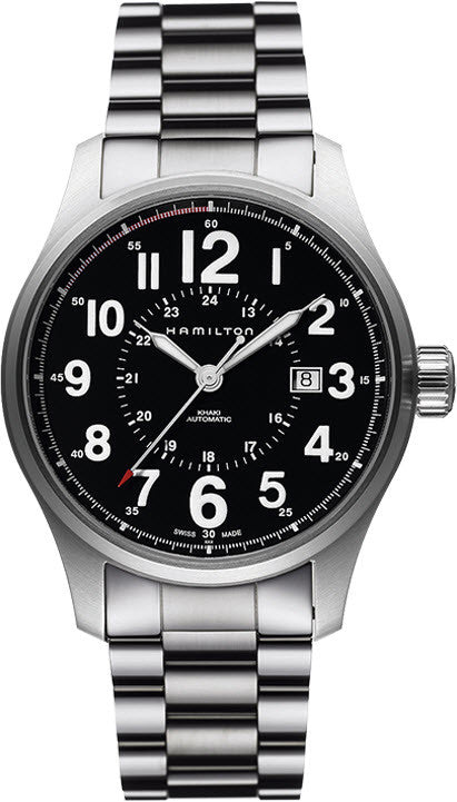 Hamilton Watch Khaki Field Officer Auto. The Khaki Officer Auto with its automatic movement blends the rugged nature of the Khaki line with the simplicity and sophistication of the Jazzmaster line. The oversized numbers on the dial make a bold statement well suited for any commanding officer.
