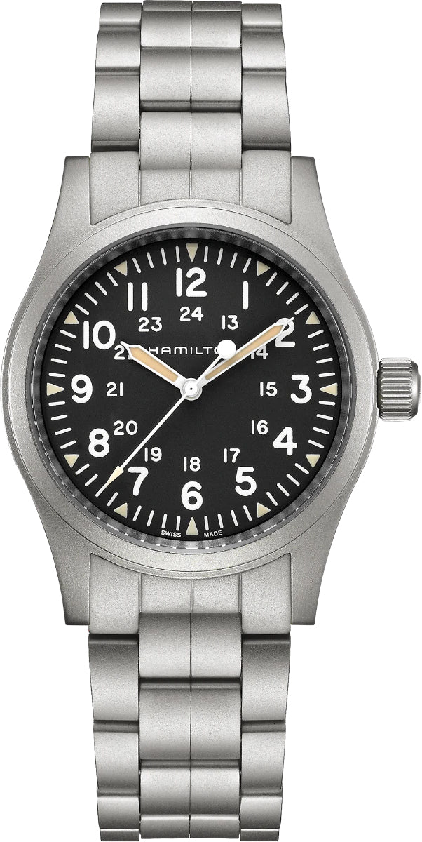 Hamilton Watch Khaki Field Mechanical H69439131. The original soldiers watch is sportier than ever with a comfortable stainless steel bracelet. Powered by exclusive H-50 handwinding movement, the Hamilton watches Khaki Field Mechanical style will not let you down. Rugged and reliable, this 38mm field watch is ready for an adventure.