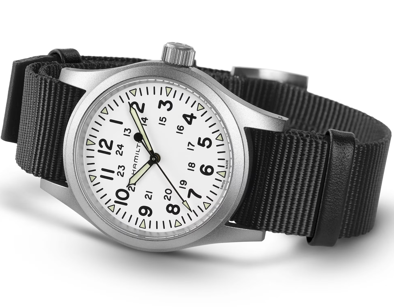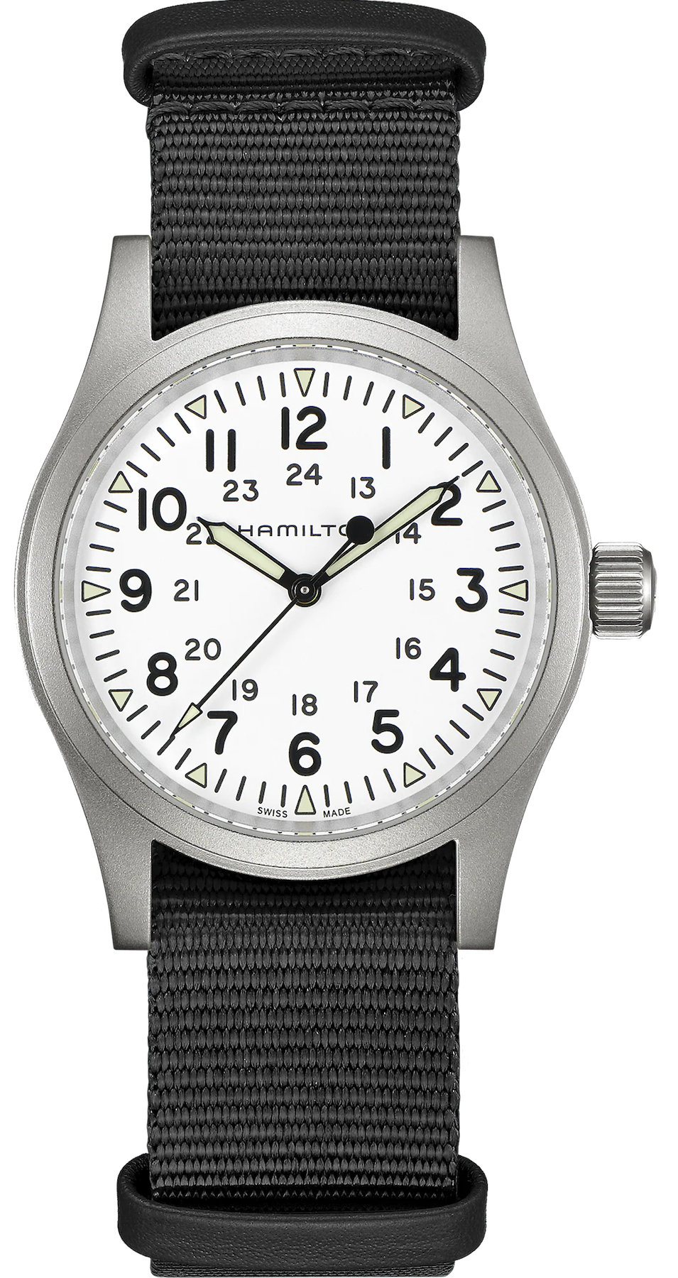 Hamilton Watch Khaki Field Mechanical H69439910. Small and mighty, the Khaki Field Mechanical is the ultimate companion when you're out in the field. Housed in a 38 mm stainless steel case, the matt white dial features contrasting black indexes and a Super-LumiNova coating for optimal legibility. Thanks to its durable NATO strap, the Khaki Field Mechanical is a faithful recreation of its original 1960s forebear and is true to Hamilton’s military heritage.