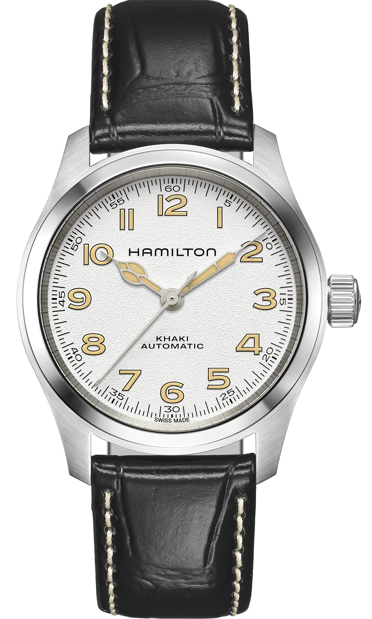 Hamilton Watch Khaki Field Murph Auto 38mm H70405710. An iconic film favorite, the original Murph is now reimagined with a modern twist. A new dial in antique white with a grained finish showcases the cathedral shaped hands, giving a vintage look to the timepiece. A piece for Hamilton and Hollywood enthusiasts, the new white dial is now available on a black leather strap.