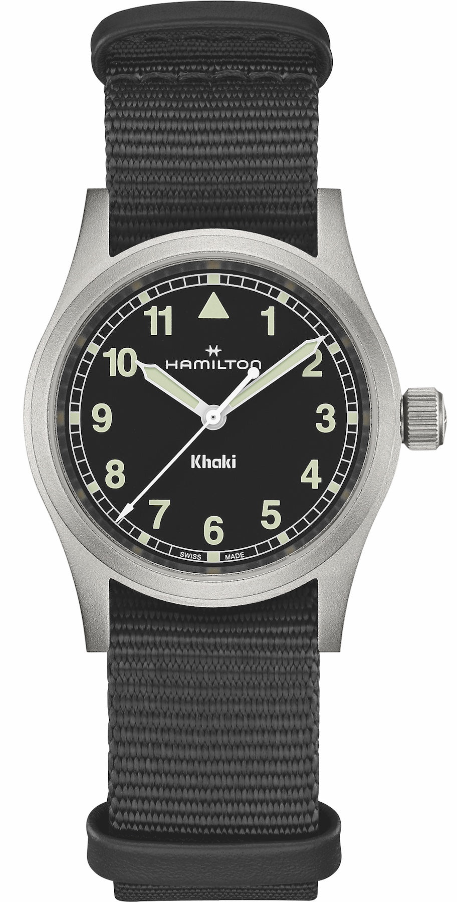 Hamilton Watch Khaki Field Quartz H69301430. The Khaki Field Quartz expresses a return to Hamilton's military heritage through simplicity in design. The dial features a clear typography with straighter Arabic numerals and a "railway" minute track. The color palette is understated, with its sleek black dial highlighted by light green Super-LumiNova indexes. The watch comes with a black textile NATO strap and black leather loops - perfect for your next adventure out in the field.