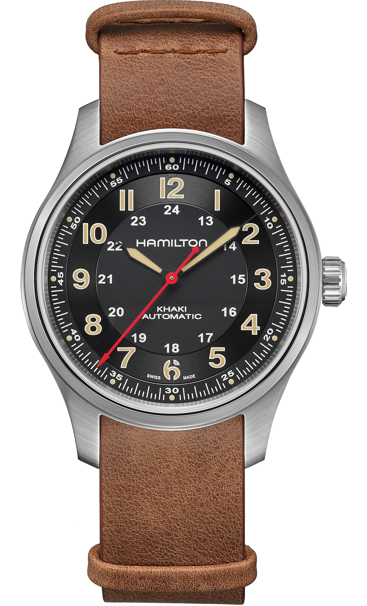 Hamilton Watch Khaki Field Titanium Far Cry 6 Limited Edition H70645533. Identical in design to the in game watch gear players can wear in Far Cry 6, an action packed video game developed and published by Ubisoft, this Khaki Field Titanium Automatic is ready for virtual and real world adventures. Featuring a 42mm titanium case and a black dial with a stylized 6 and red seconds hand, the limited edition of 1983 pieces comes with special packaging that includes an additional leather strap, strap changing tool and leather carrying case.