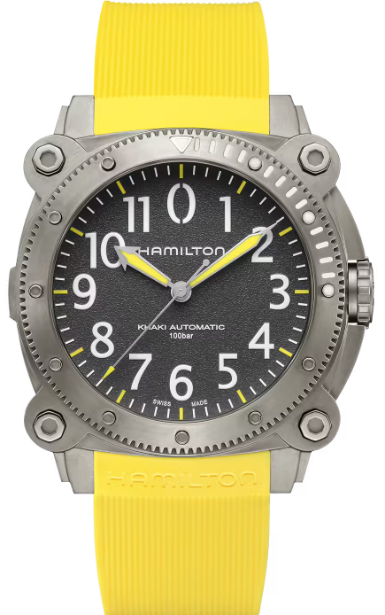 Hamilton Watch Khaki Navy Belowzero Auto Titanium H78535380. Water resistant up to 100 bar (1,000 m) and equipped with a helium escape valve, the Khaki BeLOWZERO is perfect for even the most daring of deep water adventures. The convex sapphire crystal offers high-performance protection during underwater exploration and its bright yellow rubber strap, paired with a 46mm brushed titanium case make it reminiscent of the bulk of a yellow submarine. This Hamilton is a nautical classic designed for marine pioneers.