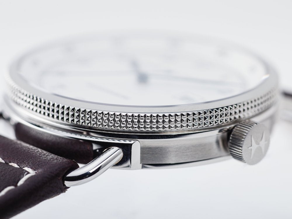 Hamilton Watch Khaki Navy Pioneer Auto H77715553. Anchoring their success in producing the most accurate chronometer for the US Navy in 1941, Hamilton revisit their historic past by reintroducing some of their finest features back into the prestigious Khaki Navy collection. A white dial nested within a 43mm stainless steel bezel welcomes flamed blue steel minute and hour hands which grace the periphery of the dial accommodating 12 crisp black Arabic numerals. A legible date window can be seen at the 3 o clock location which bears a black trim to aid easy readability. The sumptuous yet traditionally elegant look of the dial is obtained through a velvety finish which lies underneath a sapphire crystal glass front that has been treated with anti reflective and scratch resistant properties. A brown leather strap with white contrast stitching finishes a slightly vintage inspired appeal, culminating a vision which harks back to Hamilton’s historical development during the Second World War. Powered by the H10 movement, the model accomplishes reliability and precision effortlessly. The escapement regulator within this movement facilitates optimal accuracy and reliability since becoming suppressed and the entire kinematic chain has also recently been refined from the escapement right through to the barrel. The stainless steel structure which encases this beautiful timepiece is five times harder than that of normal steel, offering optimum resilience against knocks, scratches and denting. A water resistance of 100 meters reinforces the strength and stealth of the Hamilton Khaki Navy Pioneer Auto watch, whilst simultaneously retaining a sophisticated composure, becoming an invaluable collectable from the iconic Khaki Navy family.