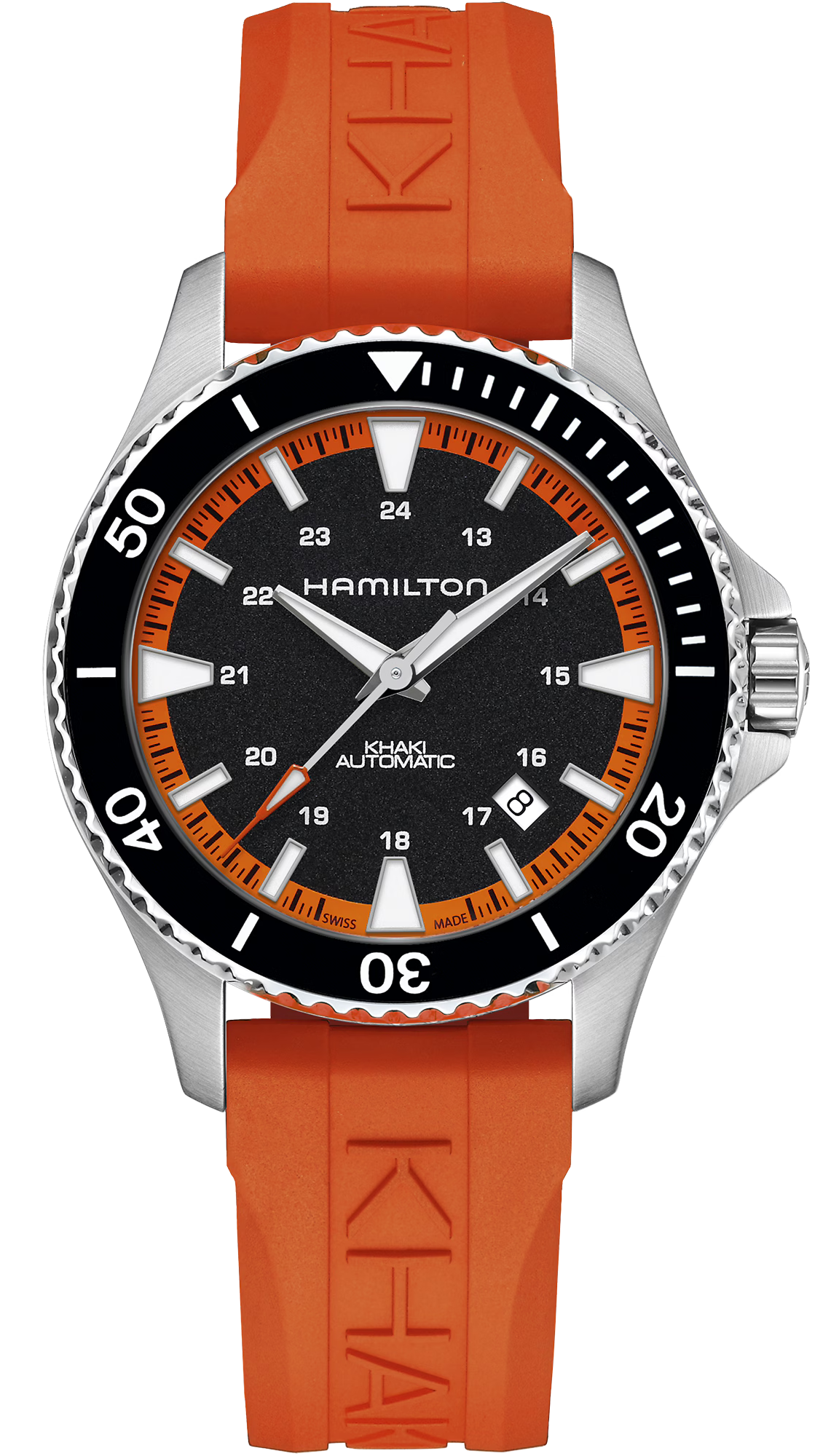 Hamilton Watch Khaki Navy Scuba Auto Tangerine Orange H82395331. Beachside, poolside or swimming in the deep ocean, the new Khaki Navy Scuba is guaranteed to make a splash in the style stakes. For modern mariners, snorkelers, surfers and beach lovers, it’s eye-catching as well as functional, thanks to its tangerine orange rubber strap and contrasting black dial. Whether you’re timing your swim, your run or your time in the sun, it will make sure you keep your cool, even in soaring temperatures.