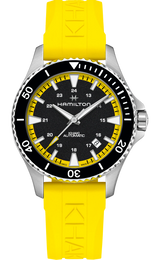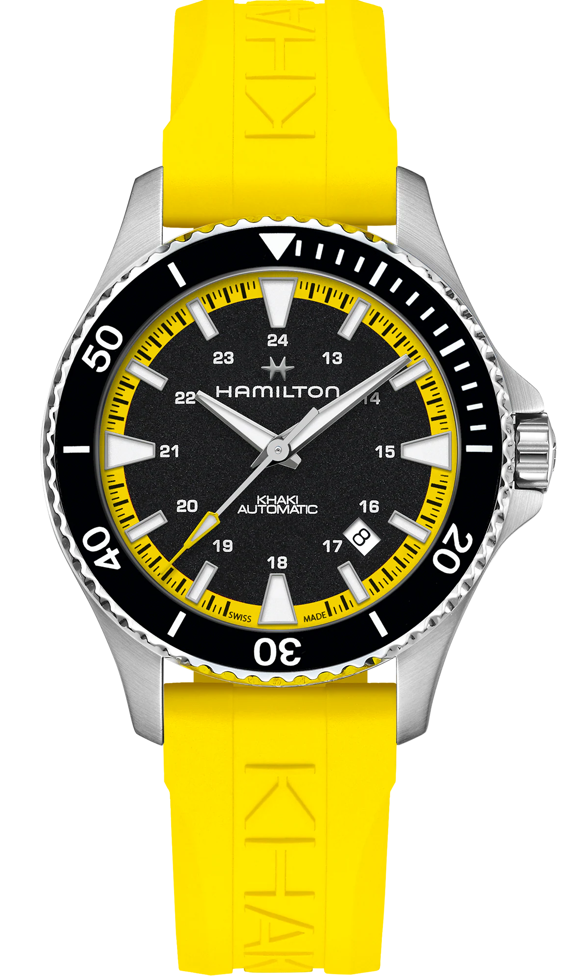 Hamilton Watch Khaki Navy Scuba Auto Acid Yellow H82395332. Beachside, poolside or swimming in the deep ocean, the new Khaki Navy Scuba is guaranteed to make a splash in the style stakes. For modern mariners, snorkelers, surfers and beach lovers, it’s eye-catching as well as functional, thanks to its acid yellow rubber strap and contrasting black dial. Whether you’re timing your swim, your run or your time in the sun, it will make sure you keep your cool, even in soaring temperatures.
