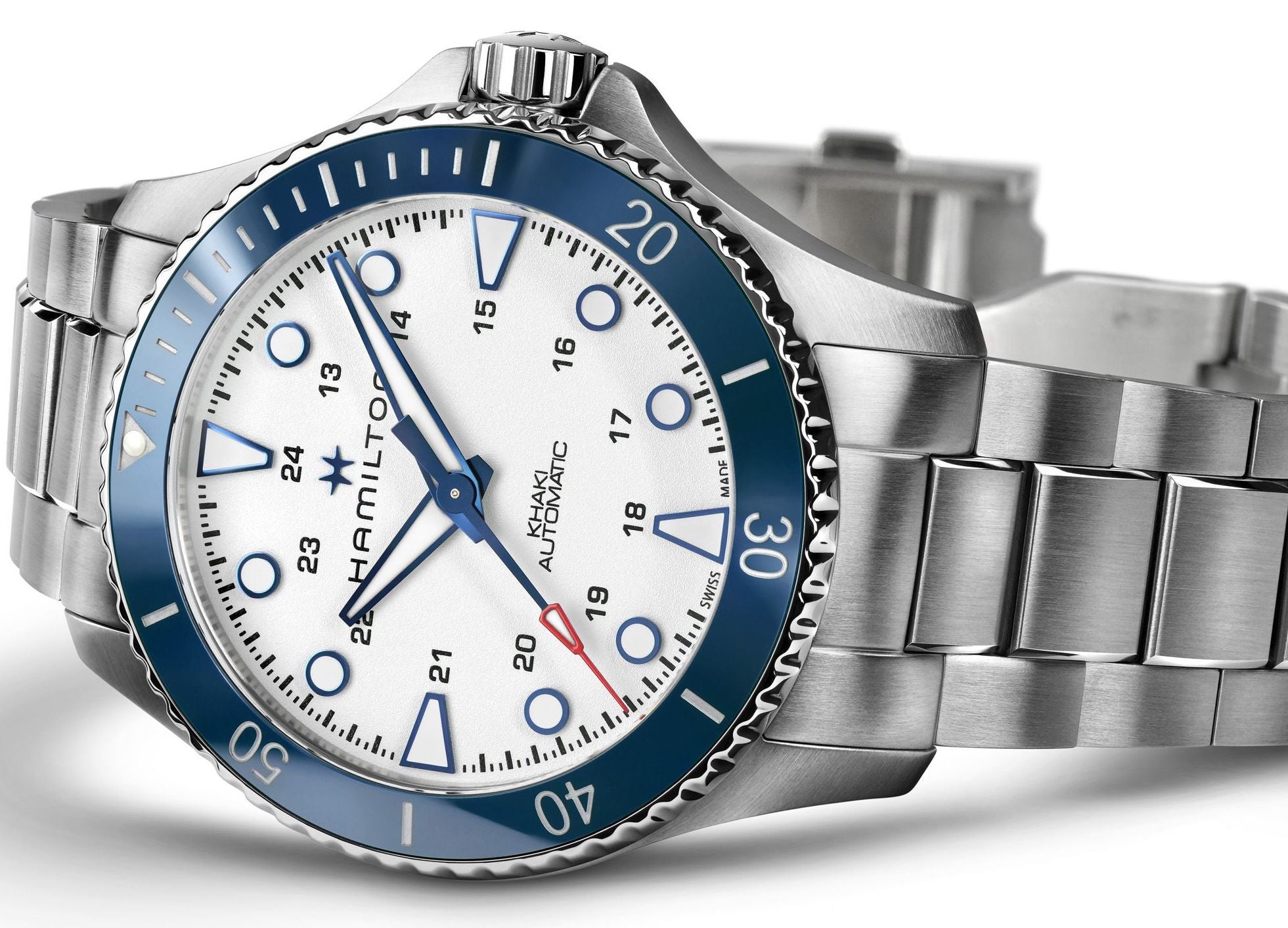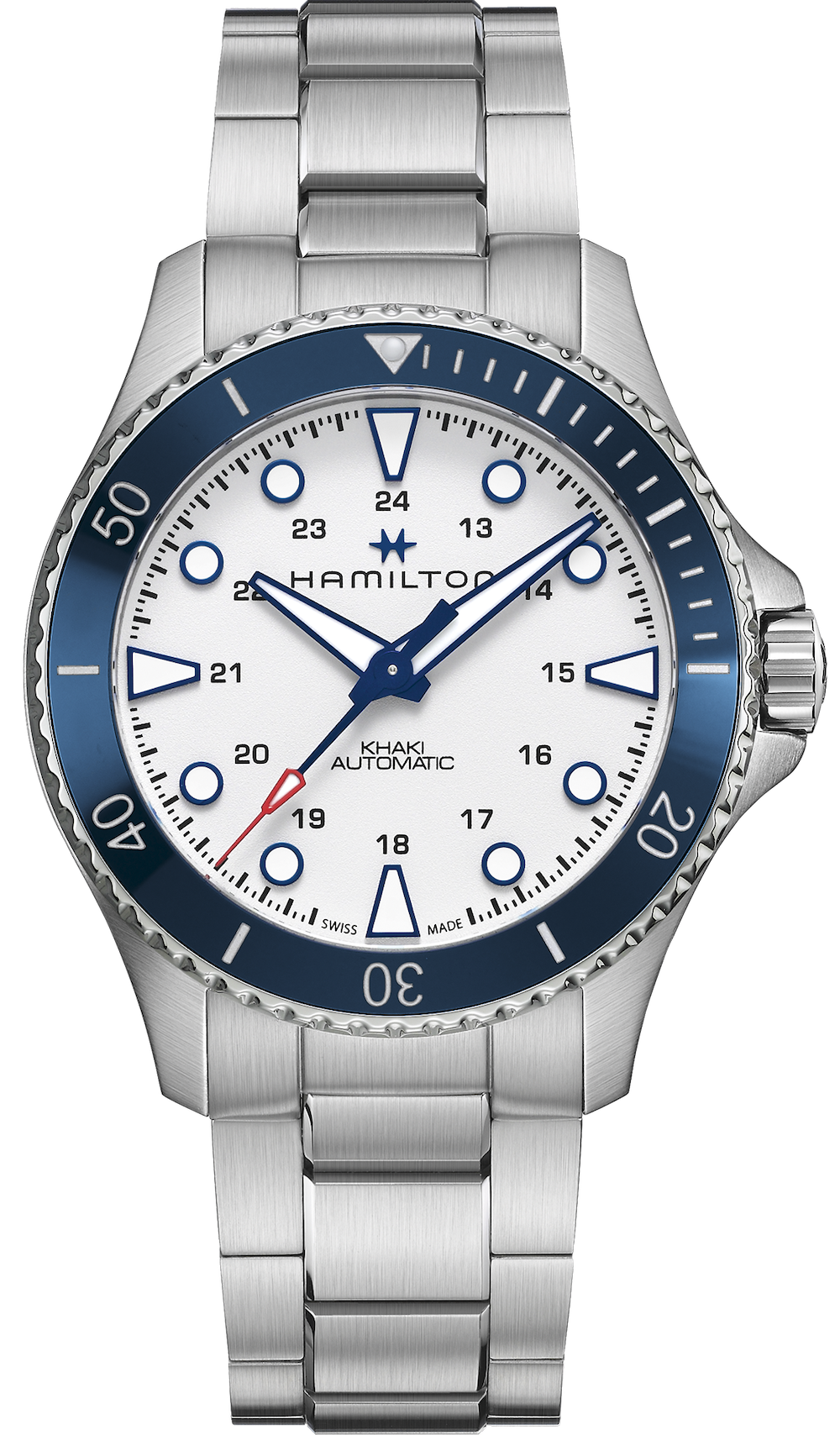 Hamilton Watch Khaki Navy Scuba Automatic H82505150. Get ready for a summer at sea with this Khaki Navy Scuba Automatic. Designed to withstand corrosive elements like sand and salt, its strikingly blue ceramic bezel adds high-seas style to this aquatic-inspired essential.