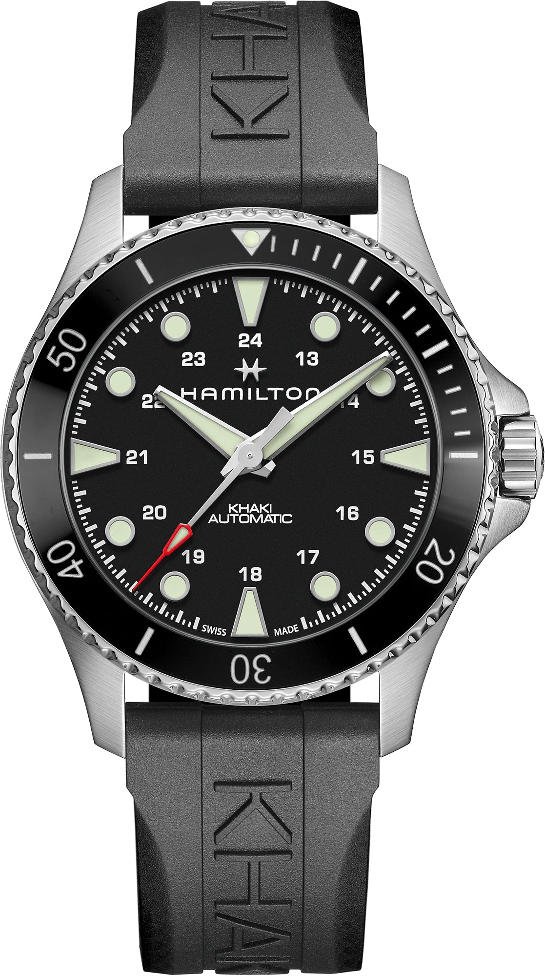 Hamilton Watch Khaki Navy Scuba H82515330. Luxury meets sport in this aquatic inspired timepiece designed to be equally at home in a seaside cabana or deep sea exploring. A ceramic bezel, featuring precisely engraved numerals adds high seas style to this Khaki Navy Scuba Automatic, and protects it from corrosive elements such as sand and saltwater. With a larger 43mm case, increased water resistance to 300m and an extra legible dial, this high performance watch is ready for all your adventures on, in or under the water.