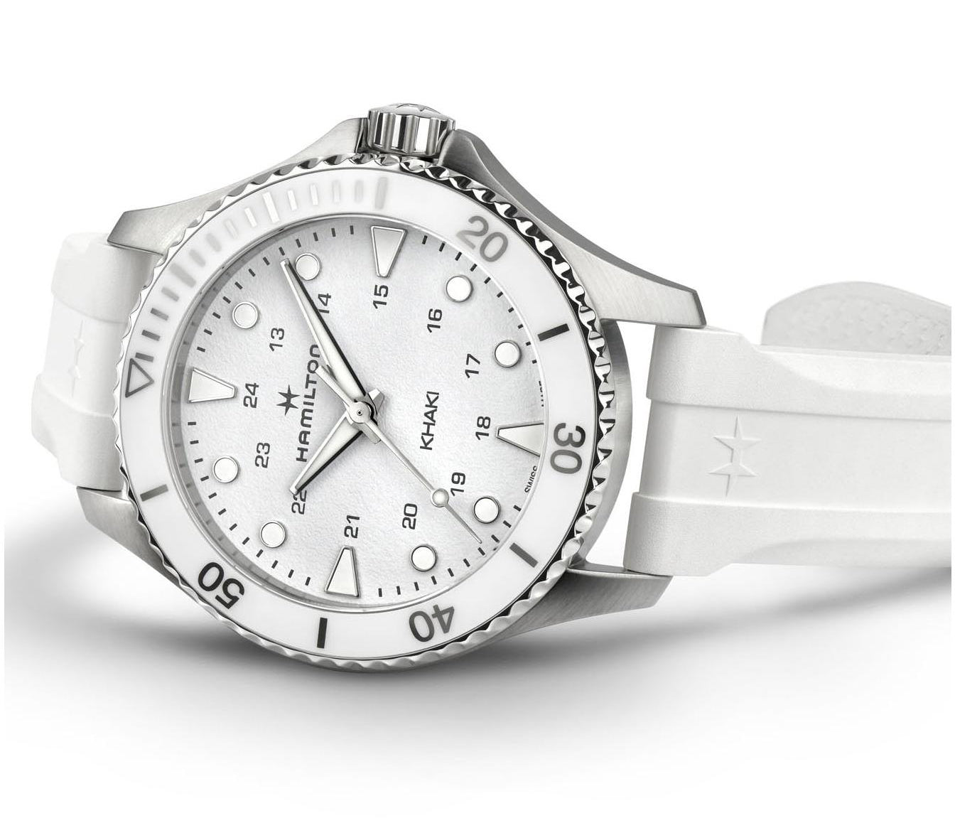 Hamilton Watch Khaki Navy Scuba Ladies H82221310. Seize the day with this striking all white Khaki Navy Scuba Quartz. A 37mm ceramic bezel, with precisely engraved numerals adds high seas style to this aquatic ready timepiece, and protects it from corrosive elements such as sand and saltwater. Paired with a matching white rubber strap or a sleek stainless steel bracelet, its luxury sport design will keep you on time for seaside vacations and deep sea explorations.