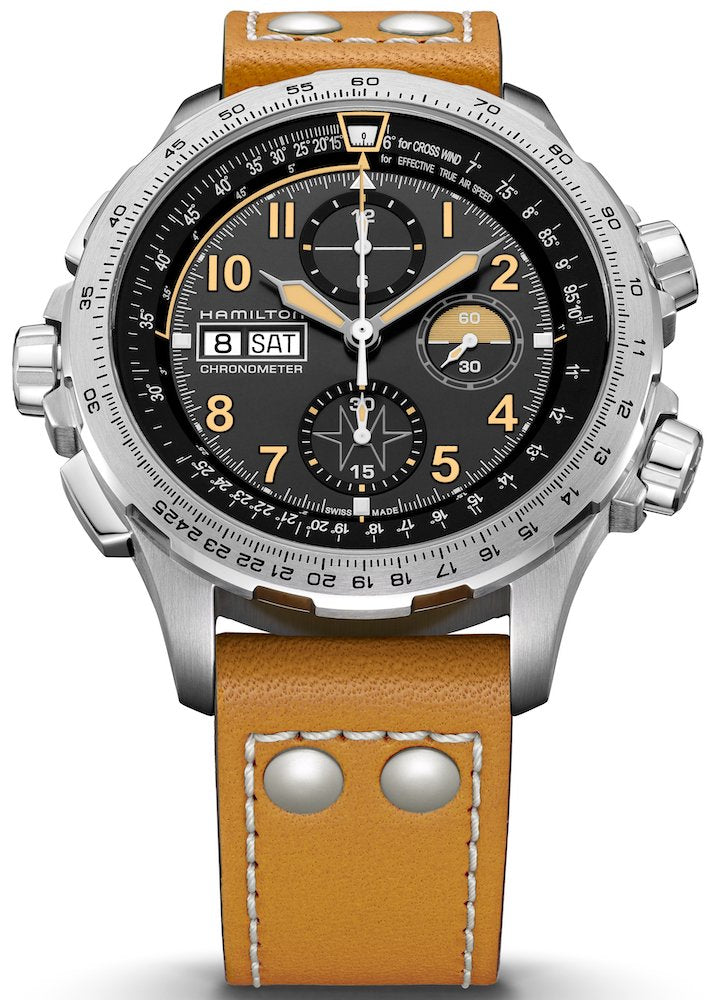 Hamilton Watch Khaki X-Wind Auto Chrono Limited Edition H77796535. Hamilton is synonymous with aviation and we are celebrating our first 100 years of timing the skies with a limited edition watch that represents the very best of Hamilton. Based on the original Khaki X-Wind Auto Chrono, the 2018 Limited Edition is packed with aviation features for pilots and offers a technical perspective including the ground breaking crosswind calculator of the original.