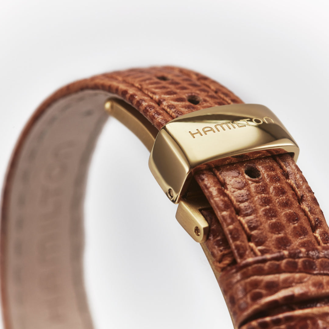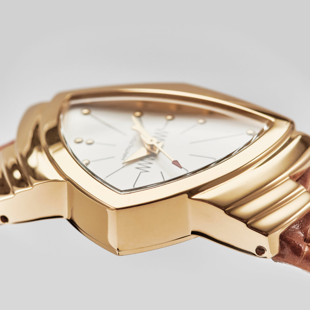 Hamilton Watch Ventura H24101511. Within this celebratory trilogy, the past meets the present with a tribute piece in quartz with a yellow gold PVD stainless steel case. In an additional flash of acknowledgement to Venturas illustrious past, a brown teju patterned leather strap, white dial with golden hour markers and hands and flash of red at the tip of the second hand provide an unmistakable touch of vintage elegance.