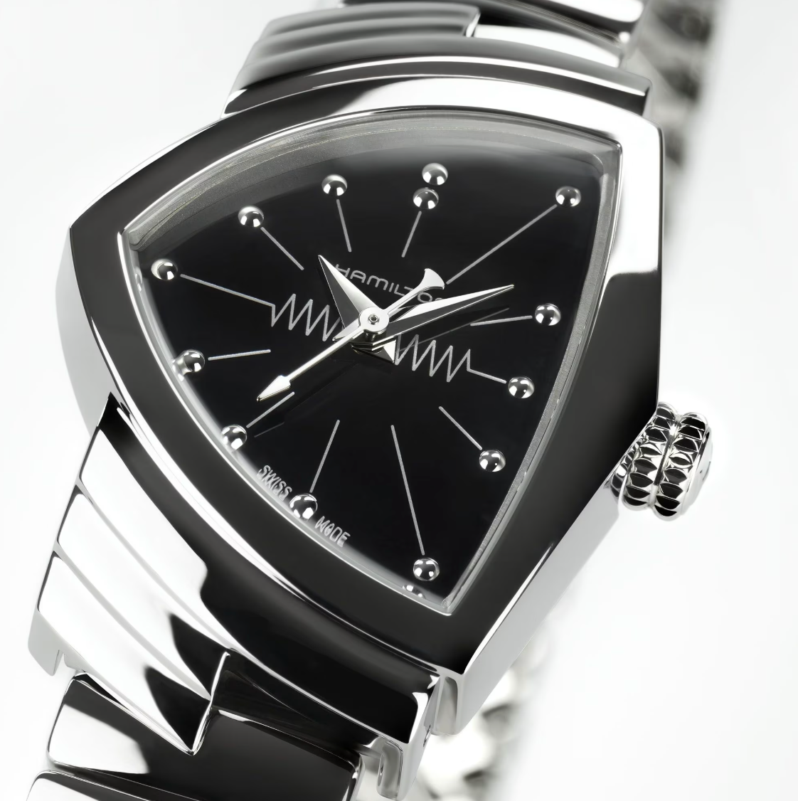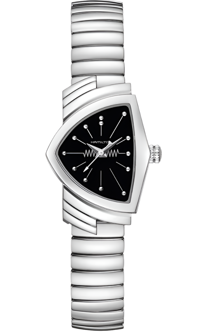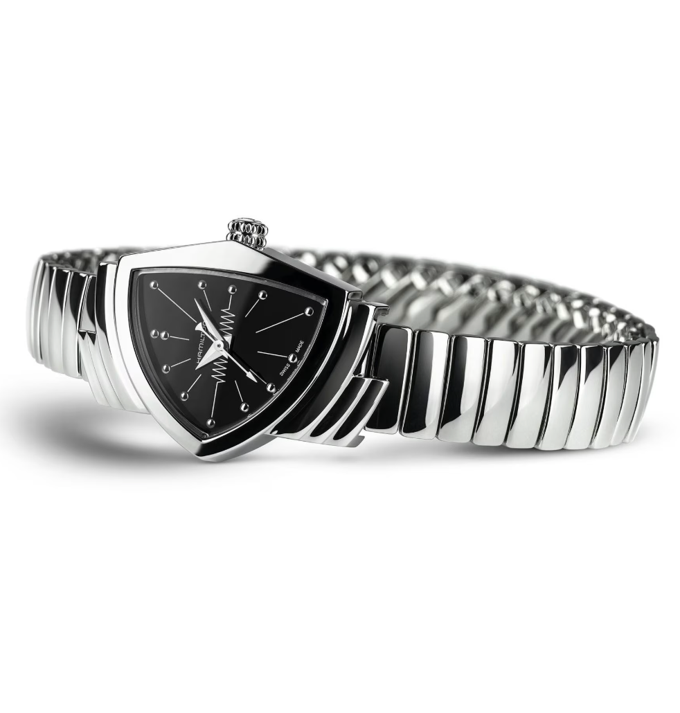 Hamilton Watch Ventura S Quartz H24211130. The King of Rock ‘n’ Roll was known for the incredible flexibility that was the key to his signature dance moves. He embodied the American spirit and himself owned an original Ventura Flex. This is the inspiration behind the Ventura S Quartz, which revives the flexible bracelet for the ultimate twenty-first century tribute to Mid-Century Modern design.