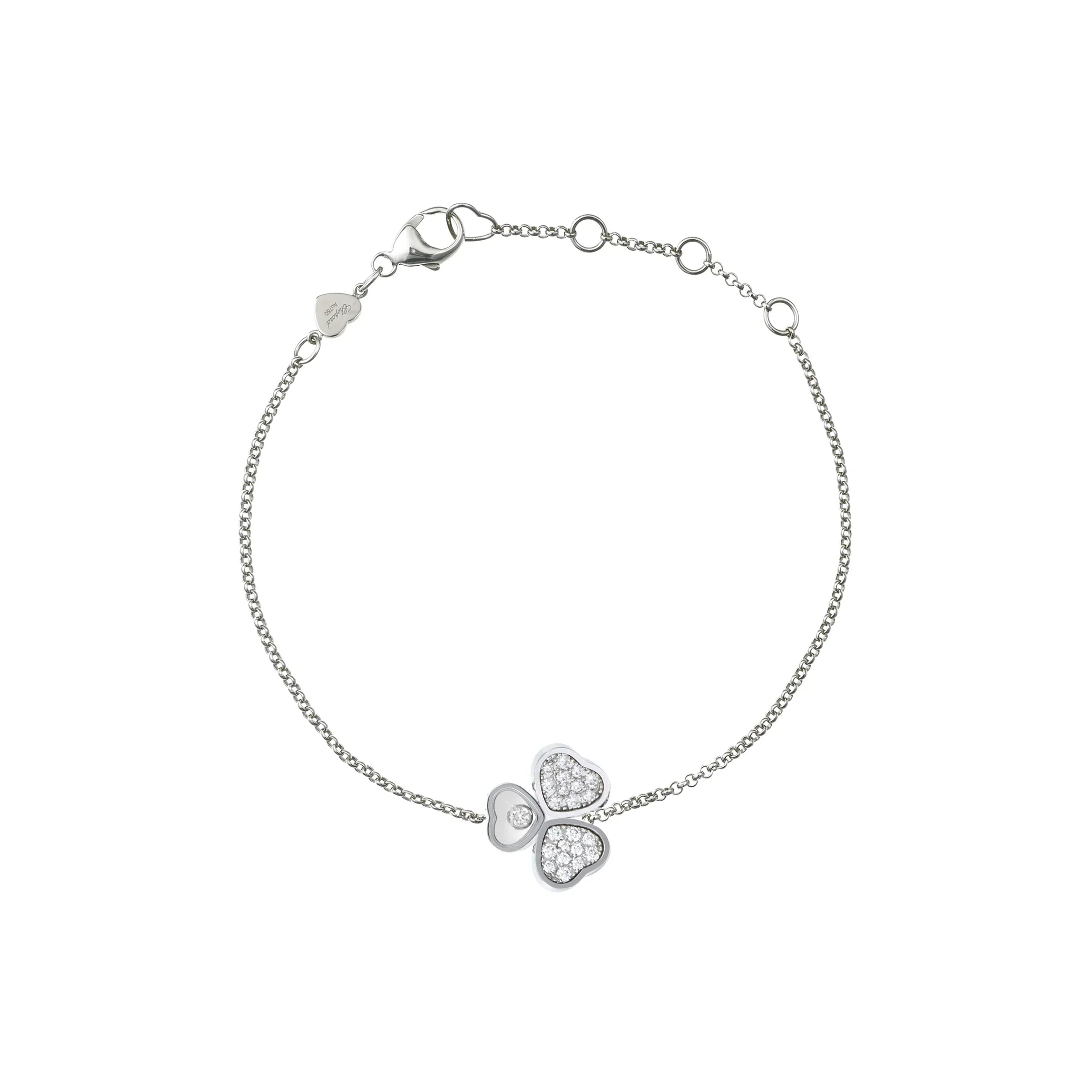 The butterfly, the ultimate emblem of lightness, has infused all its delicacy and symbolic strength into Happy Hearts Wings diamond chain bracelets. It finds exquisitely refined expression in the design of this luxury jewelry collection, echoing the symbols of the Maison Chopard. Two white gold and diamond hearts, arranged like butterfly wings, are suspended from a heart with a dancing diamond nestling inside.