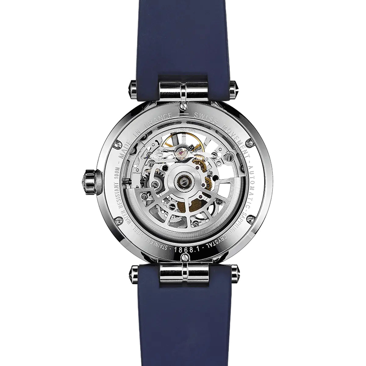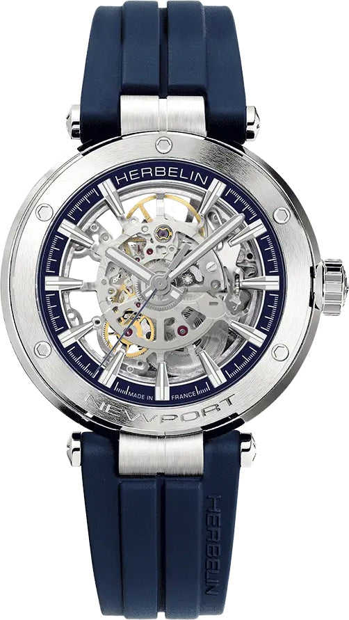 Herbelin Watch Newport Skeleton 1868SQ15CB. Inspired by the portholes of transatlantic sailing ships, Newport, an iconic line created in 1988, continues to reinvent itself.