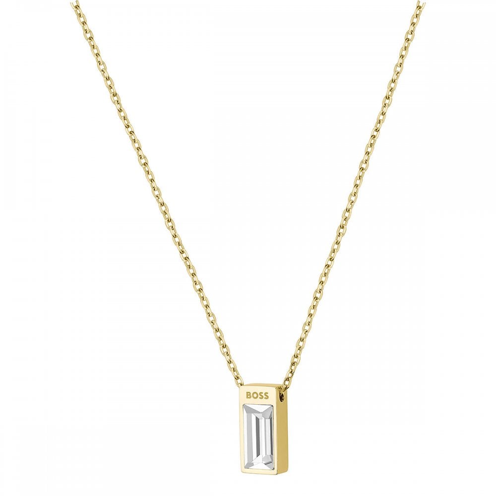 BOSS ladies necklace from the Clia collection. Features light yellow gold IP chain necklace with crystal baguette pendant. Length 508mm with 50mm extender. Pendant 14 x 6.75mm.