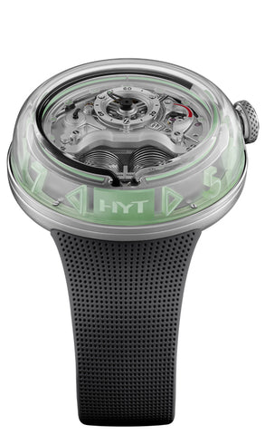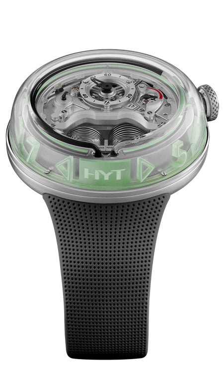 HYT Watches H5 Black Fluid Limited Edition H02353. HYT Watches was born of a question. time flows and only gains meaning through content. So why limit its measurement to indicating the now in splendid isolation, with needle sharp hands or fleeting digital display. Determined that its rebellion should make statements and waves, a multi disciplinary think tank set out to create timepieces that visibly connect the past, present and future.