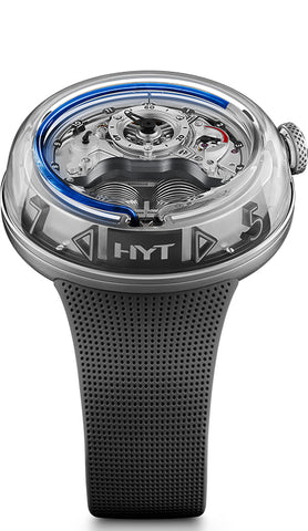 HYT Watches H5 Blue Fluid Limited Edition H02352. HYT Watches was born of a question. time flows and only gains meaning through content. So why limit its measurement to indicating the now in splendid isolation, with needle sharp hands or fleeting digital display. Determined that its rebellion should make statements and waves, a multi disciplinary think tank set out to create timepieces that visibly connect the past, present and future.