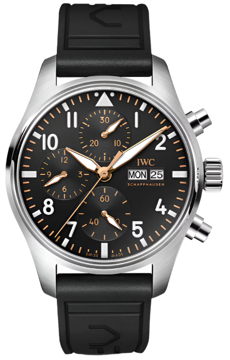 IWC Watch Pilot’s Chronograph APX GP 41mm Black IW388116. Dedicated to the fictional “APXGP team from the movie F1®, the Pilot’s Watch Chronograph 41 APXGP features a design in the team’s colors with black, gold and white elements. A stainless steel case with a diameter of 41 millimeters is combined with a black dial, which is printed with white numerals and golden minute markers. The minute and hour hands and the hands in the subdials are gold-plated and filled with white Super-LumiNova®. The tinted sapphire glass case back features the “APXGP logo printed in gold, while a special laser engraving on the durable and water-proof black rubber strap also commemorates the fictional team from the movie. Thanks to the EasX-CHANGE® strap change system, the strap can be exchanged at a touch of a button and without any tools. The Pilot’s Watch Chronograph 41 APXGP is powered by the IWC-manufactured 69385 calibre.
