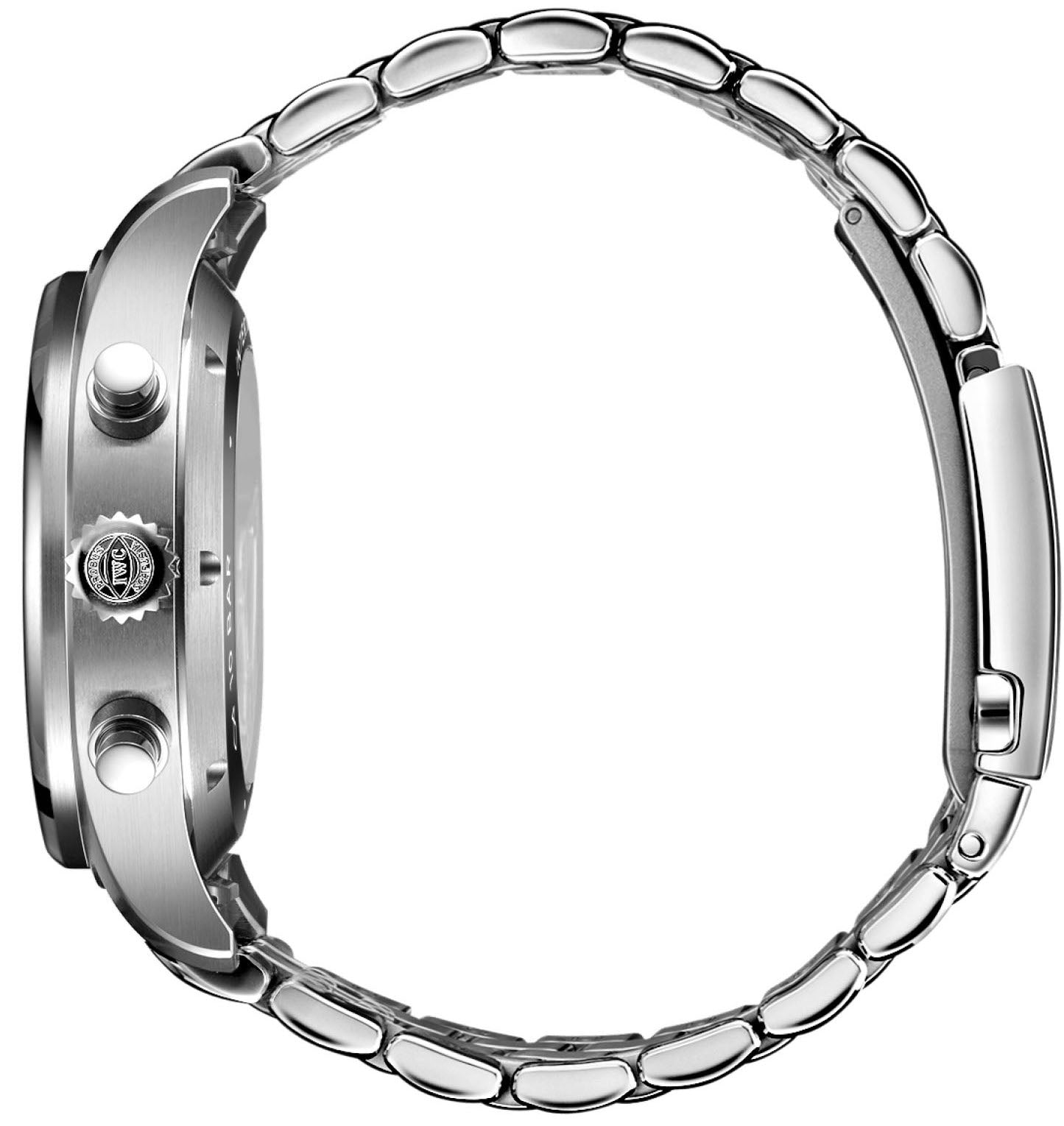 Chronographs have formed an integral part of IWC Schaffhausen’s Pilot’s Watches collection since 1994. This Pilot’s Watch Chronograph features a stainless steel case with a diameter of 43 millimeters, a green dial, and rhodium-plated hands. The high-contrast dial with large Arabic numerals and the triangle index marker at 12 o’clock has been designed in the style of an easy-to-read cockpit instrument. Thanks to luminescent elements, the time can be read at a glance, even at night, or in difficult visibility conditions. The IWC-manufactured 69385 caliber, a precise and robust chronograph movement in classic column-wheel design, enables measurement of stop or aggregate times of up to 12 hours. The hours are displayed on the counter at 9 o’clock, the minutes at 12 o’clock. The small second features a red hand and is located at 6 o’clock. The self-winding movement with a power reserve of 46 hours is visible through the sapphire glass back. Water-resistant to 10 bar, the chronograph is fitted on a 5-link stainless steel bracelet with a folding clasp. Thanks to the integrated EasX-CHANGE® system, the strap can be easily changed without additional tools.