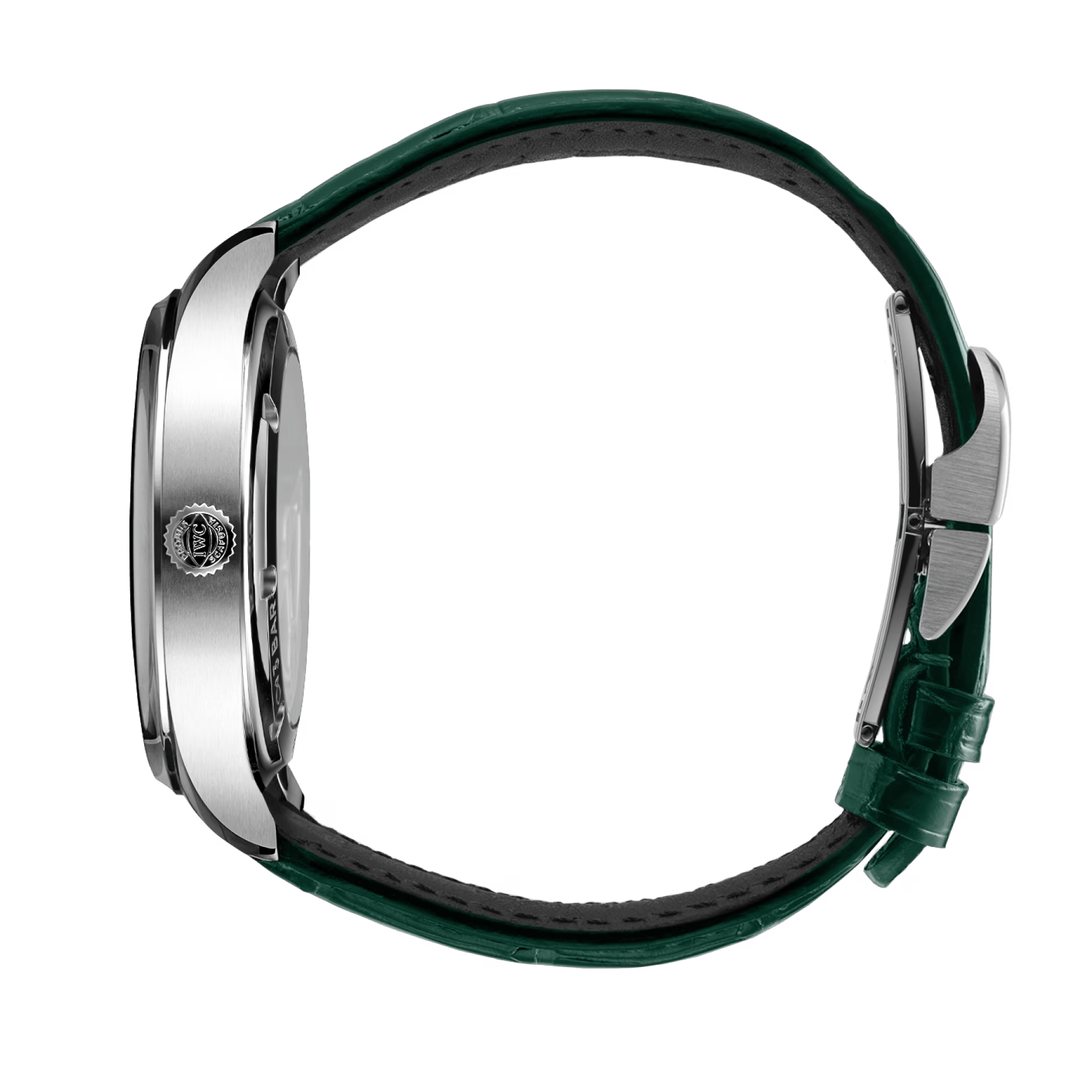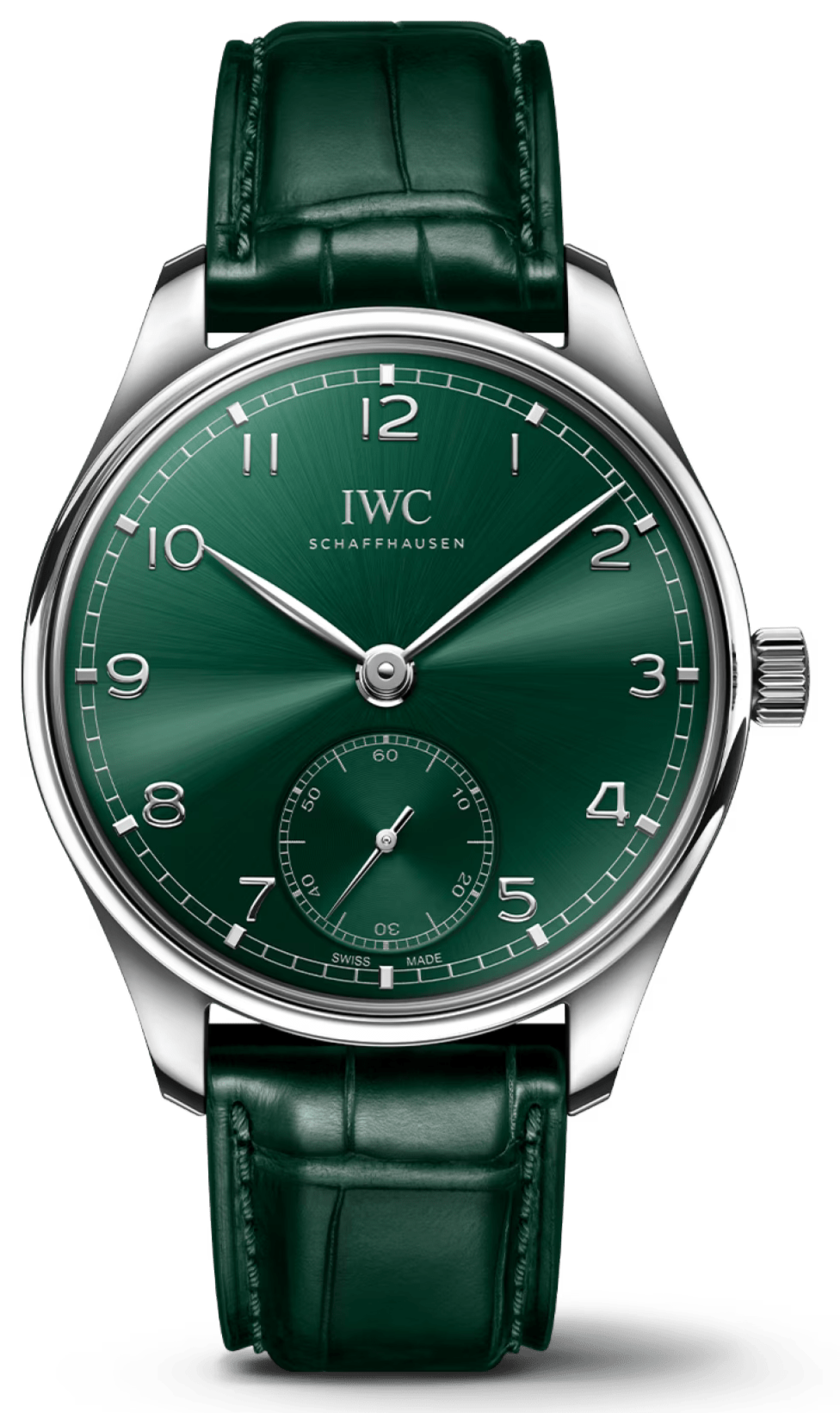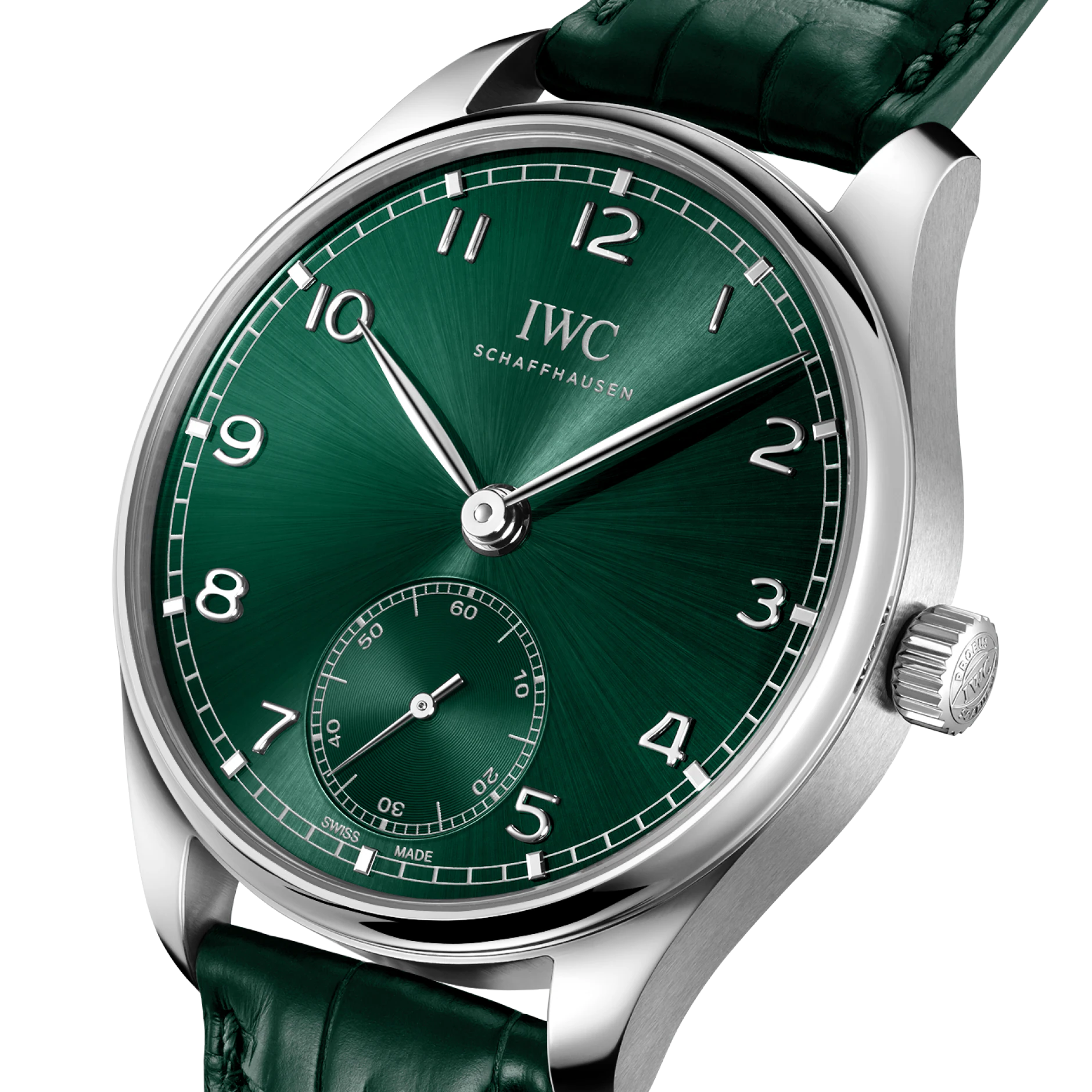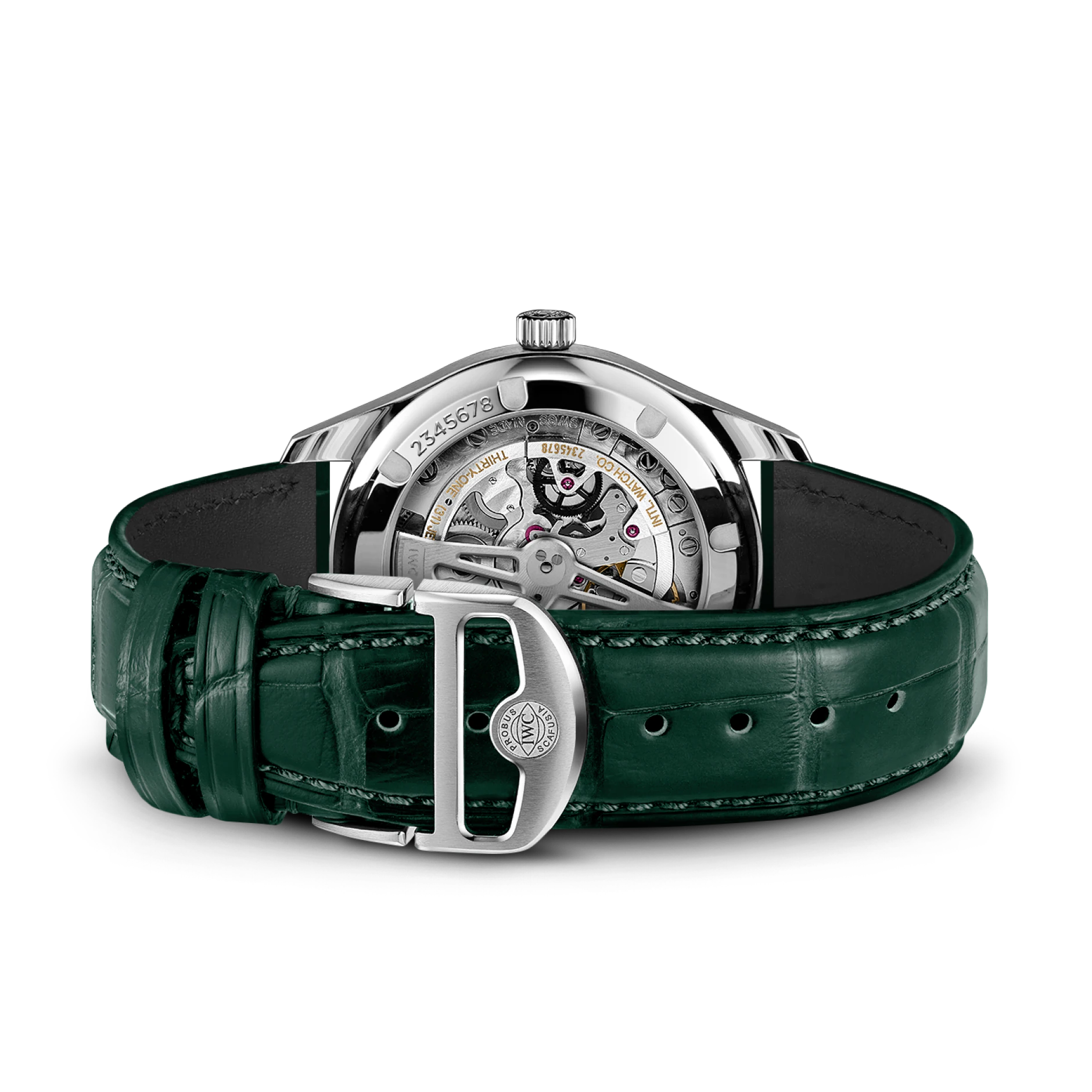 A clearly organized and open dial, with the characteristic minutes scale and the small seconds at "6 o’clock"; IWC’s Reference 325 in the late 1930s established a classic design idiom that has run as a common thread through the history of the Portugieser family ever since. Now the timelessly modern design returns to the collection in an automatic model with a compact case diameter of 40 millimetres. The Portugieser Automatic 40 is powered by the IWC-manufactured 82200 calibre. This robust, high-quality automatic movement has a Pellaton winding system with components made of virtually non-wearing ceramic, which builds up a power reserve of 60 hours. This model features a stainless-steel case, a green dial, as well as rhodium-plated hands and appliqués. It is fitted with a green alligator leather strap. Thanks to the butterfly folding clasp, the watch is particularly comfortable to wear.