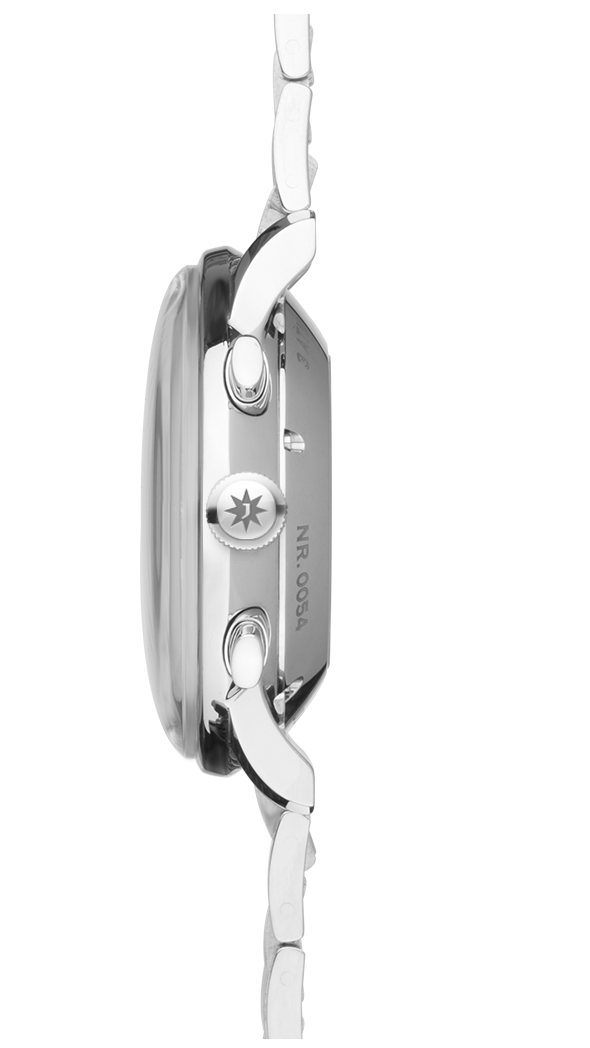 The sleek stainless steel case of this Meister Chronoscope watch measures to a comfortable 40.7mm in width and 13.9mm in height and comes fitted with a sophisticated stainless steel bracelet and folding buckle. Housed within the case is the self winding J880.1 movement, a German made calibre that equips the piece with hour, minute and central chronograph seconds, a subsidiary dial for 30 minutes and 12 hours, a subsidiary dial for standard seconds, a day and date aperture and a power reserve of 48 hours. The movement can also be seen through the stunning exhibition case back. This men’s Junghans Meister Chronoscope watch continues to impress with convex hard plexiglass with coating for enhanced scratch resistance, 30 metre water resistant case and matte silver plated dial decorated with luminous hour and minute hands.